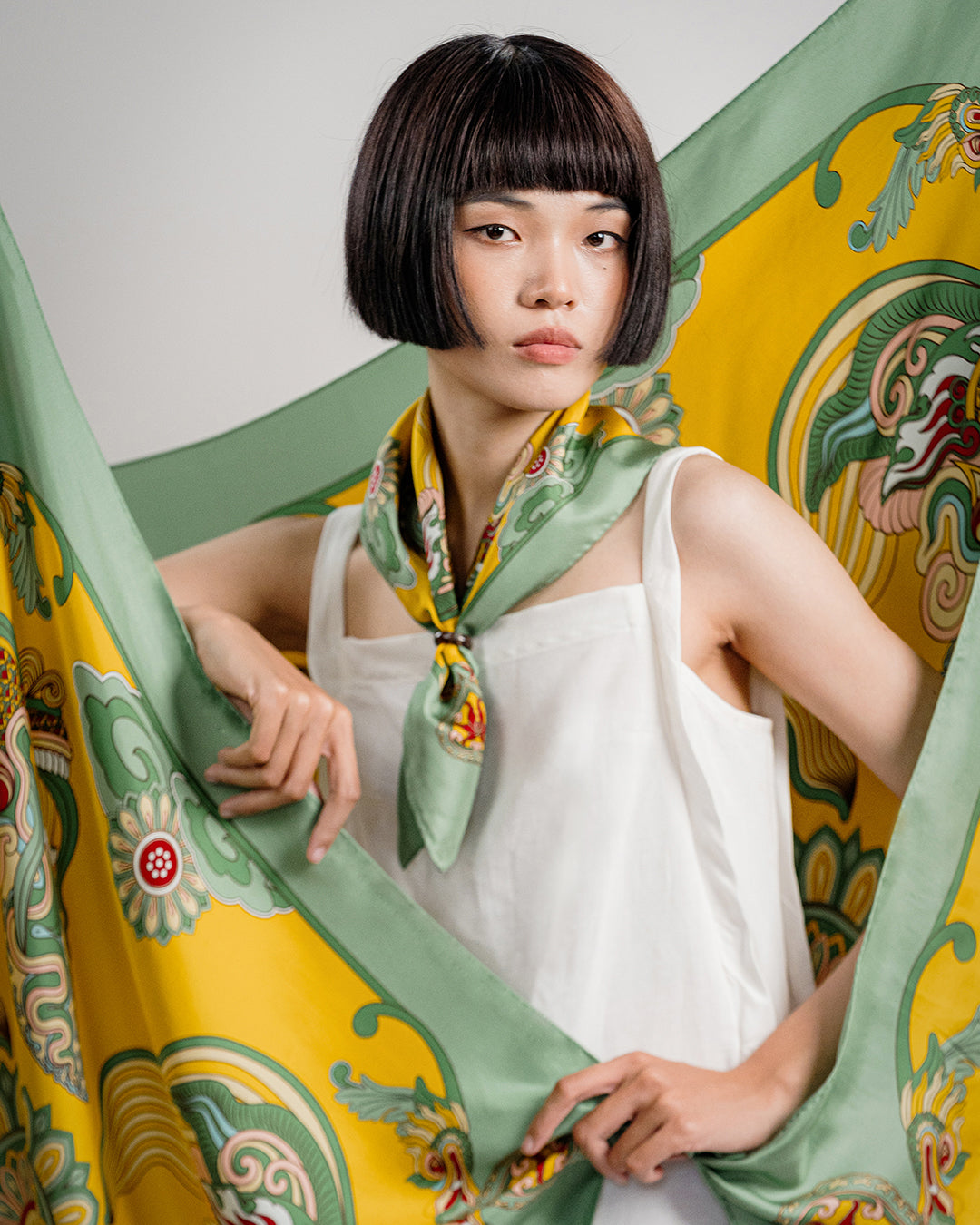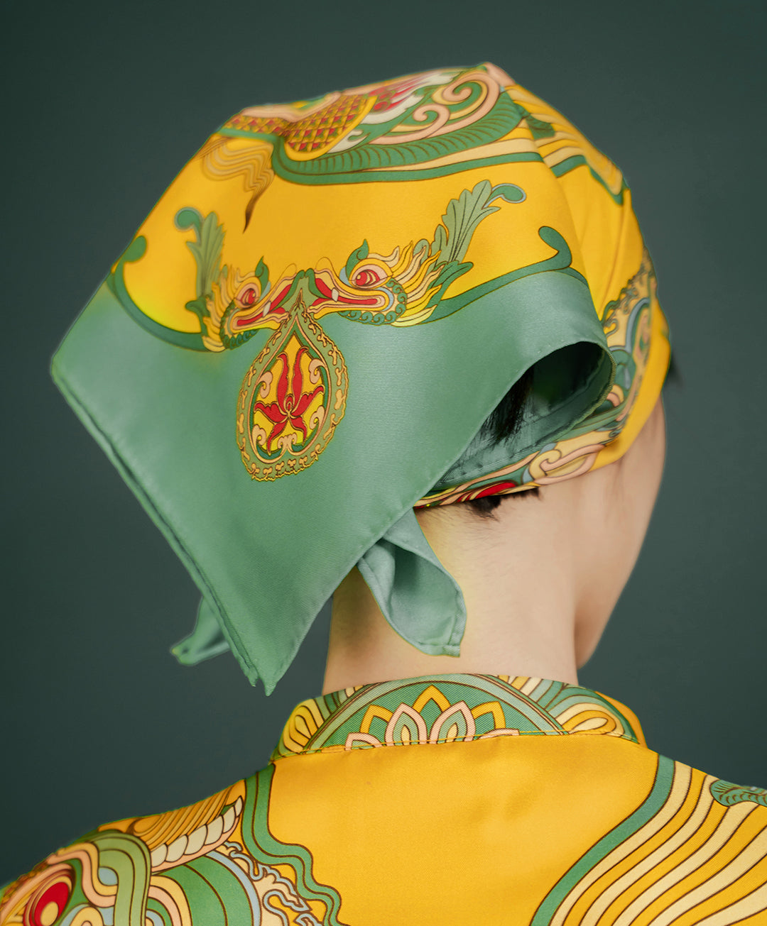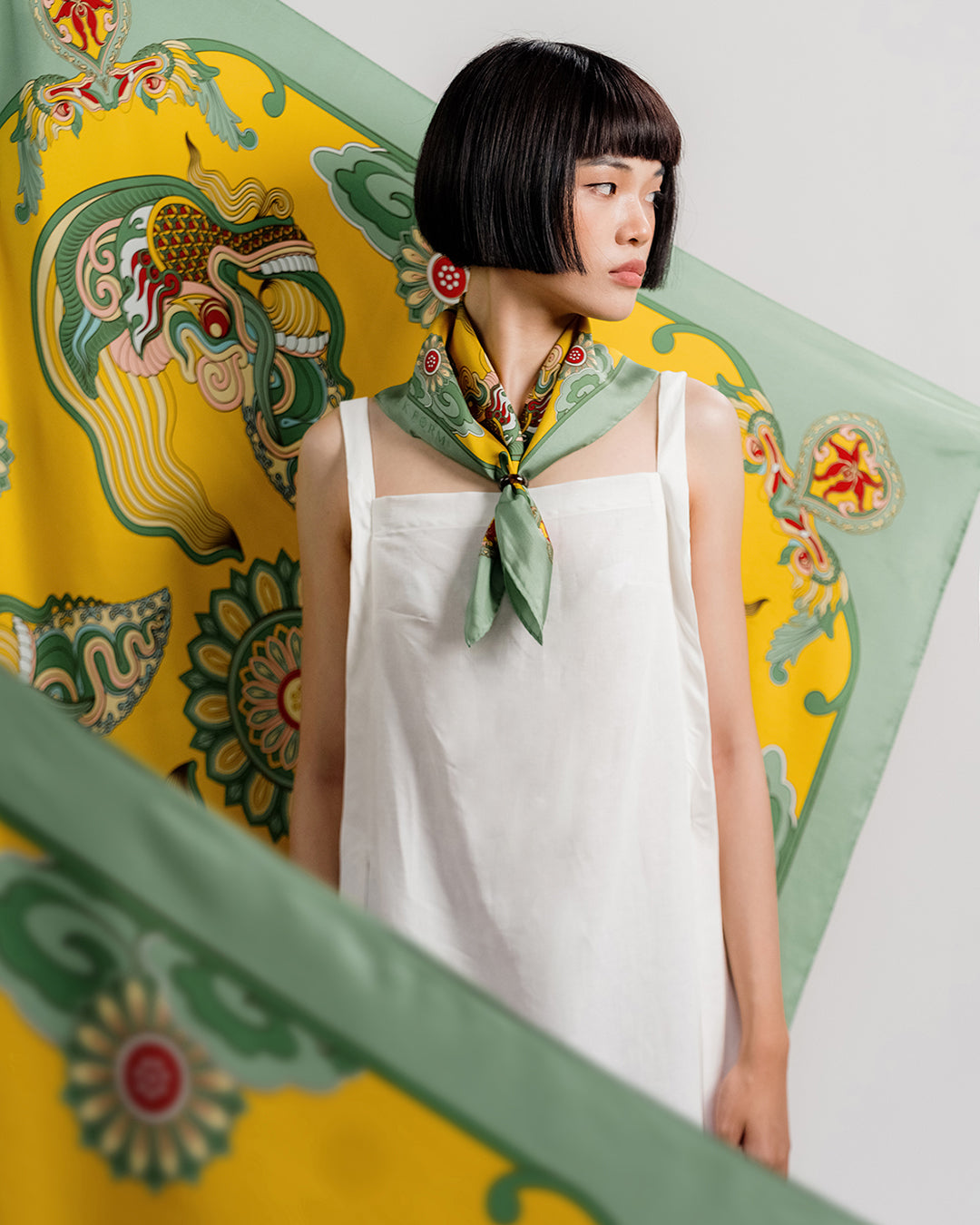Inspired by thousand-year history of Thăng Long Citadel, "Dragon Dreams" is recreated from the original artifacts such as dragon of Ly Dynasty, the curved rooflines with Xi Van - the Roof guardian of imperial architecture, Bodhi leaves from the flourishing Buddhist era and the iconic lotus pedestal of the 11th-14th centuries… recreating a mystical realm between reality and dream, past and present, where sacred dragons unite on the scarves of our time.