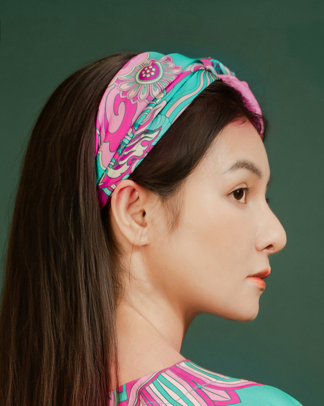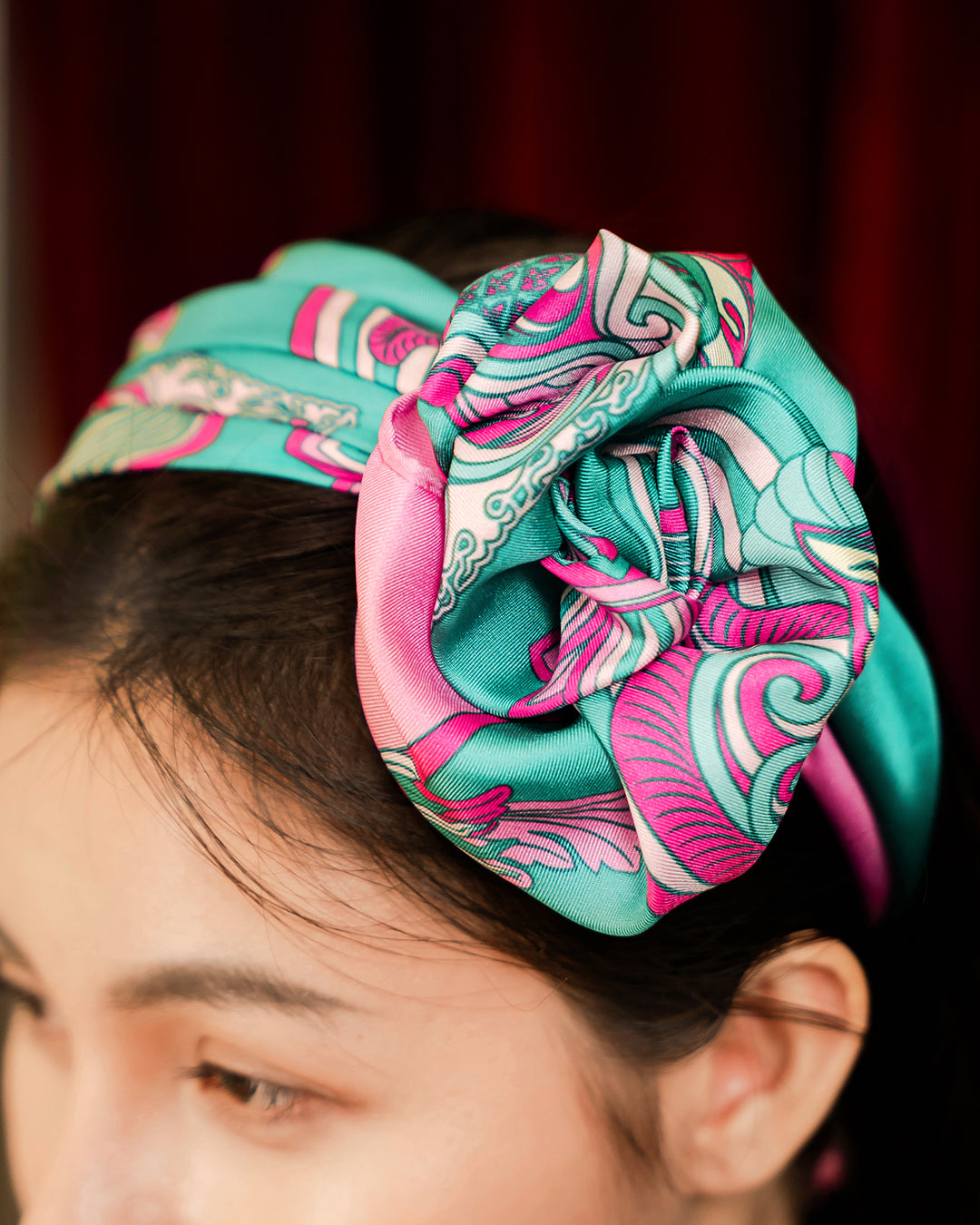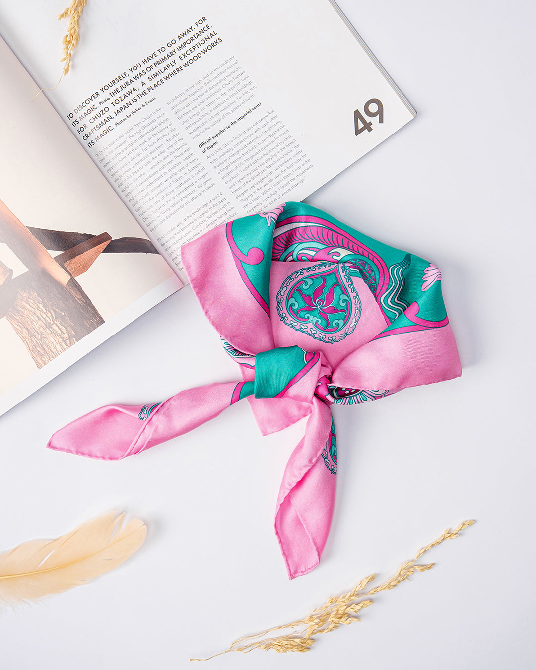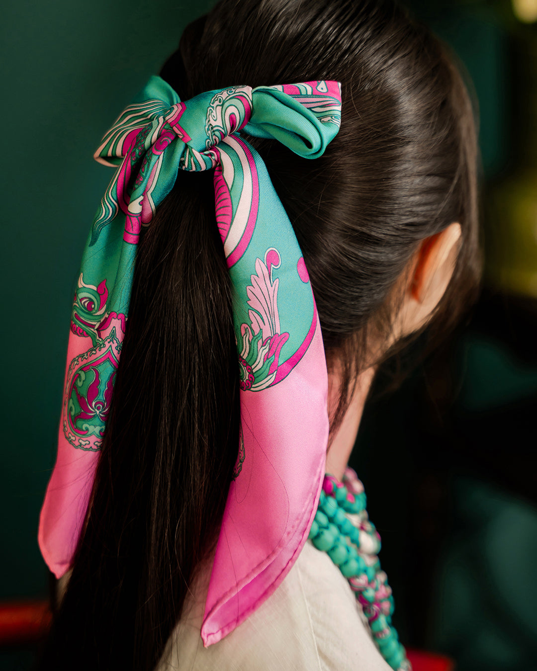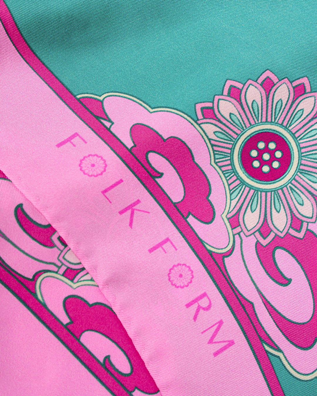 Folk Form's pink & turquoise silk scarf adds a touch of luxury and offers natural moisture retention, breathability, and gentle softness. Perfect for sensitive skin, it reduces friction, hair breakage, and frizz, enhancing shine. Style it any way you want in your own mood and creativity!