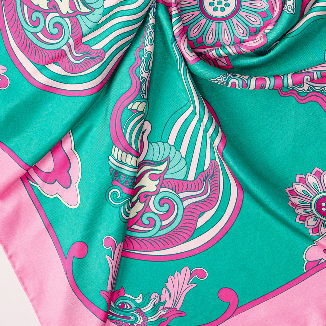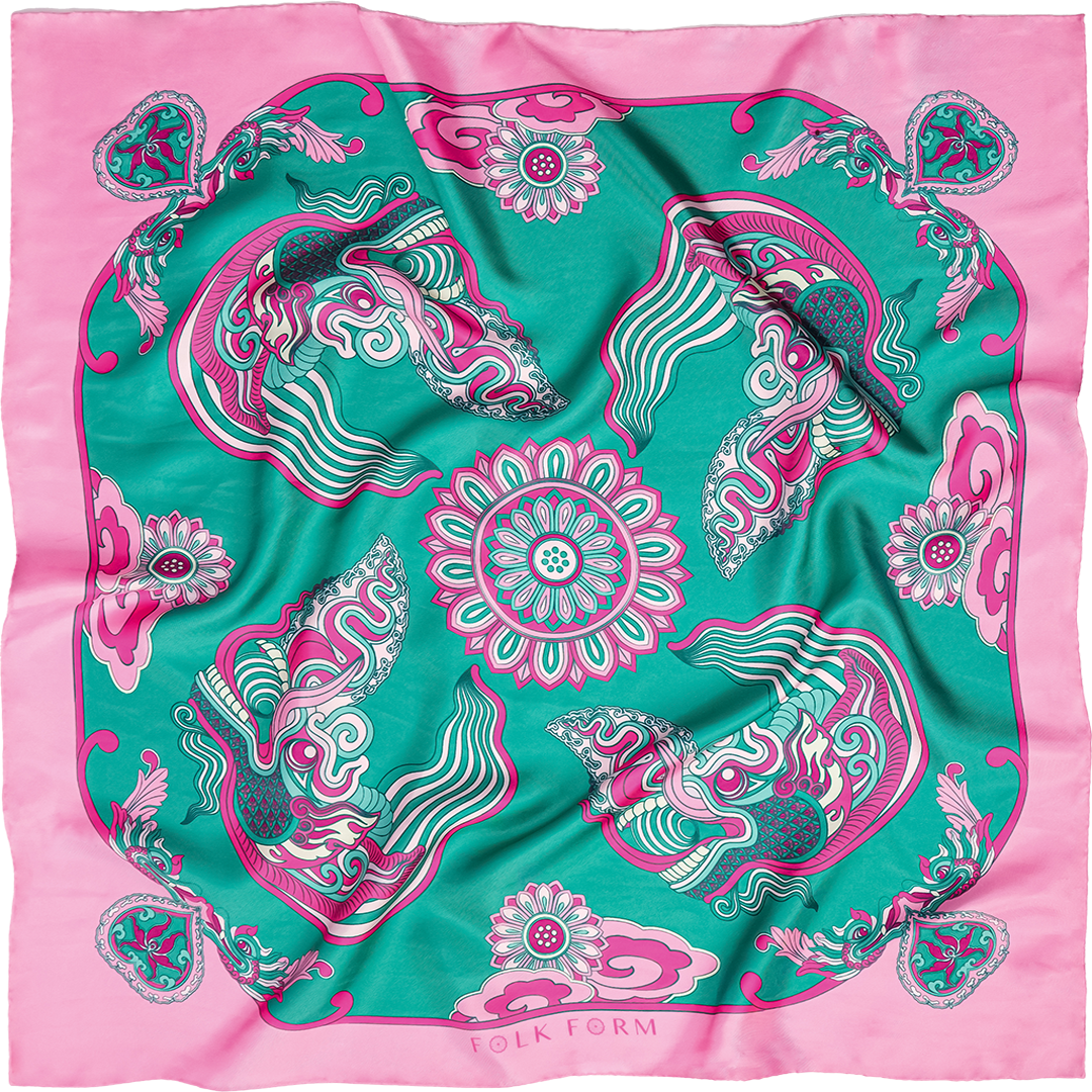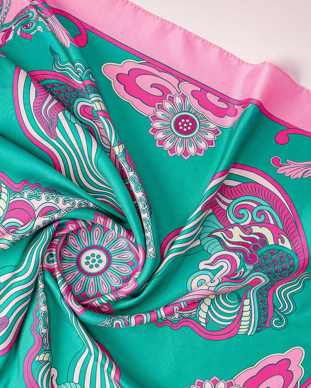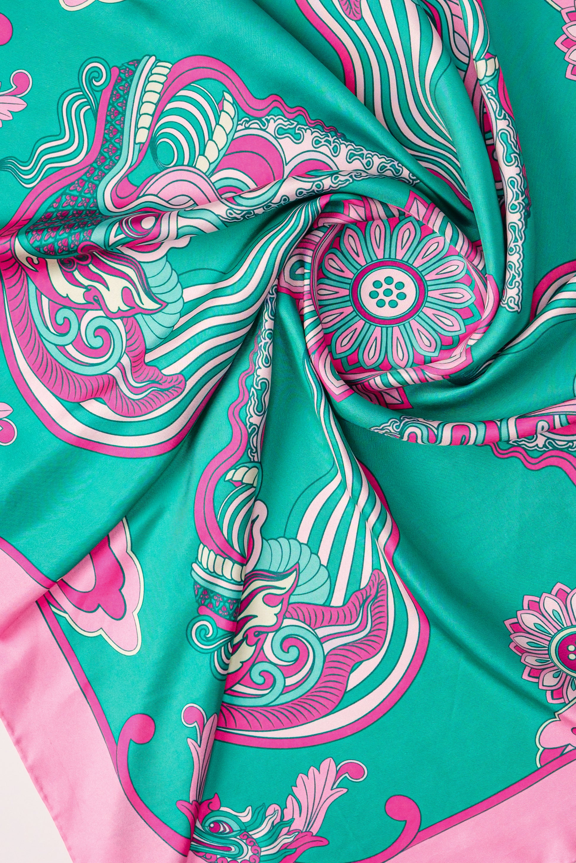 Dragon Dreams Silk Scarf / Pink & Turquoise / 65x65cm / 26x26in