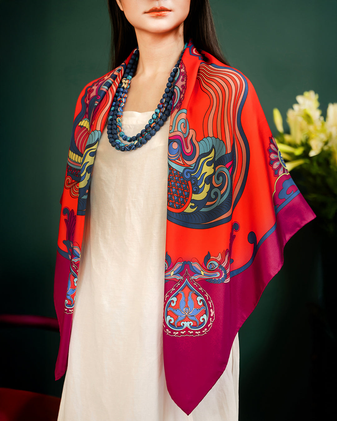 Inspired by Vietnamese royal heritage (Asian culture), the "Dragon Dreams" Silk Scarf features a dragon—a timeless symbol of strength, wisdom, and good fortune.