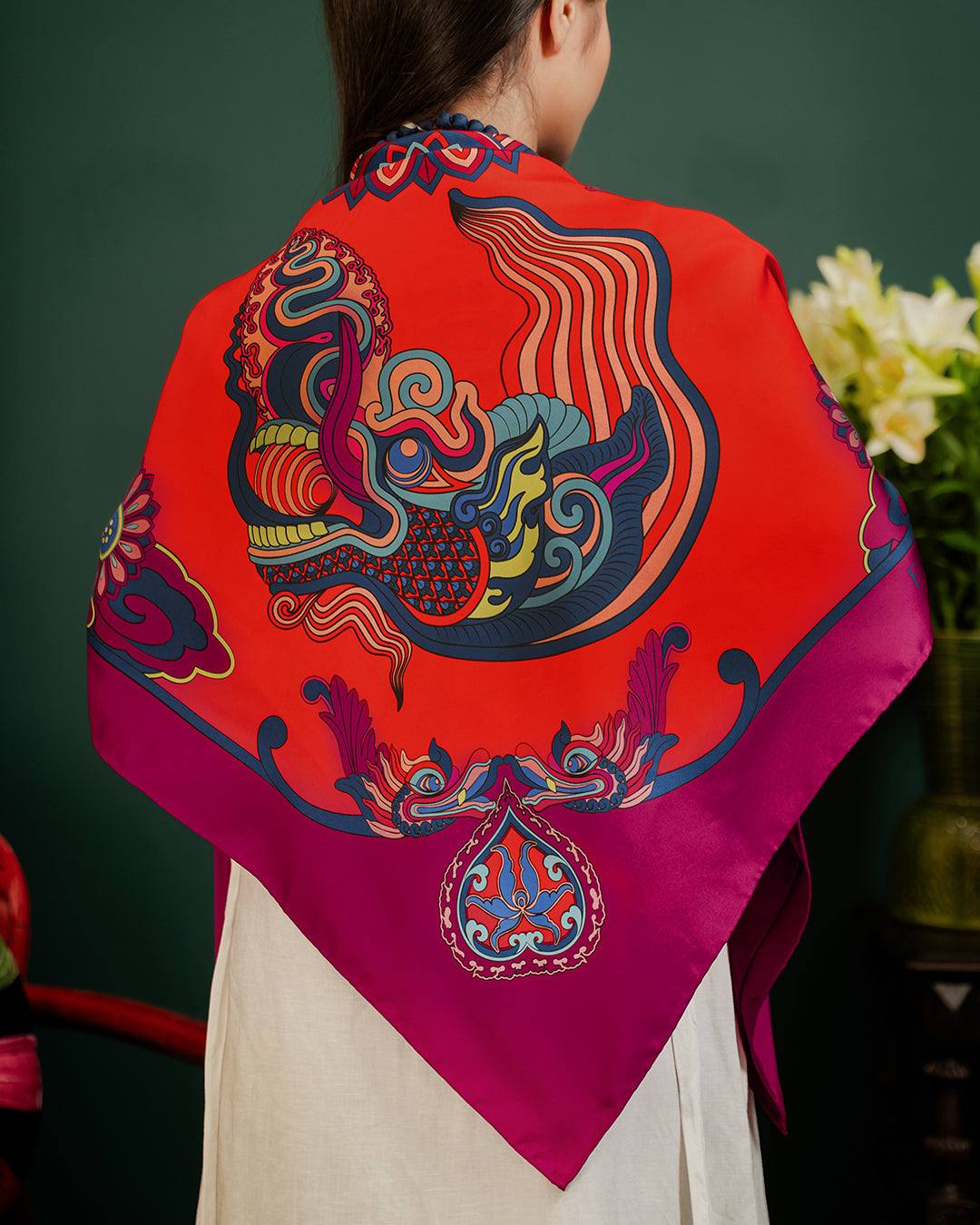 "Dragon Dreams" print on silk scarves recreates the Ly Dynasty Dragon in a spiral composition converging toward the Lotus Throne. The border features pairs of Xi Van, ancient roof guardians protecting against fire, enclosing a mystical sky of swirling clouds, bodhi leaves, and lotus flowers. With graceful lines and harmonious colors, these scarves breathe new life into heritage, honoring Vietnamese culture on its journey to the world.
