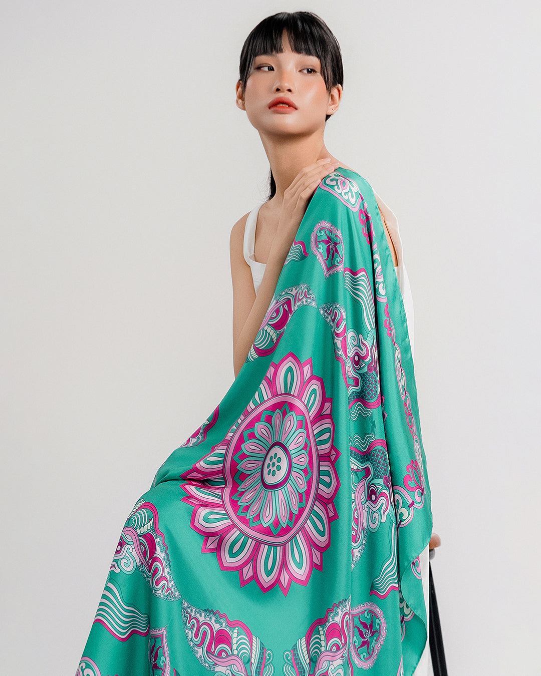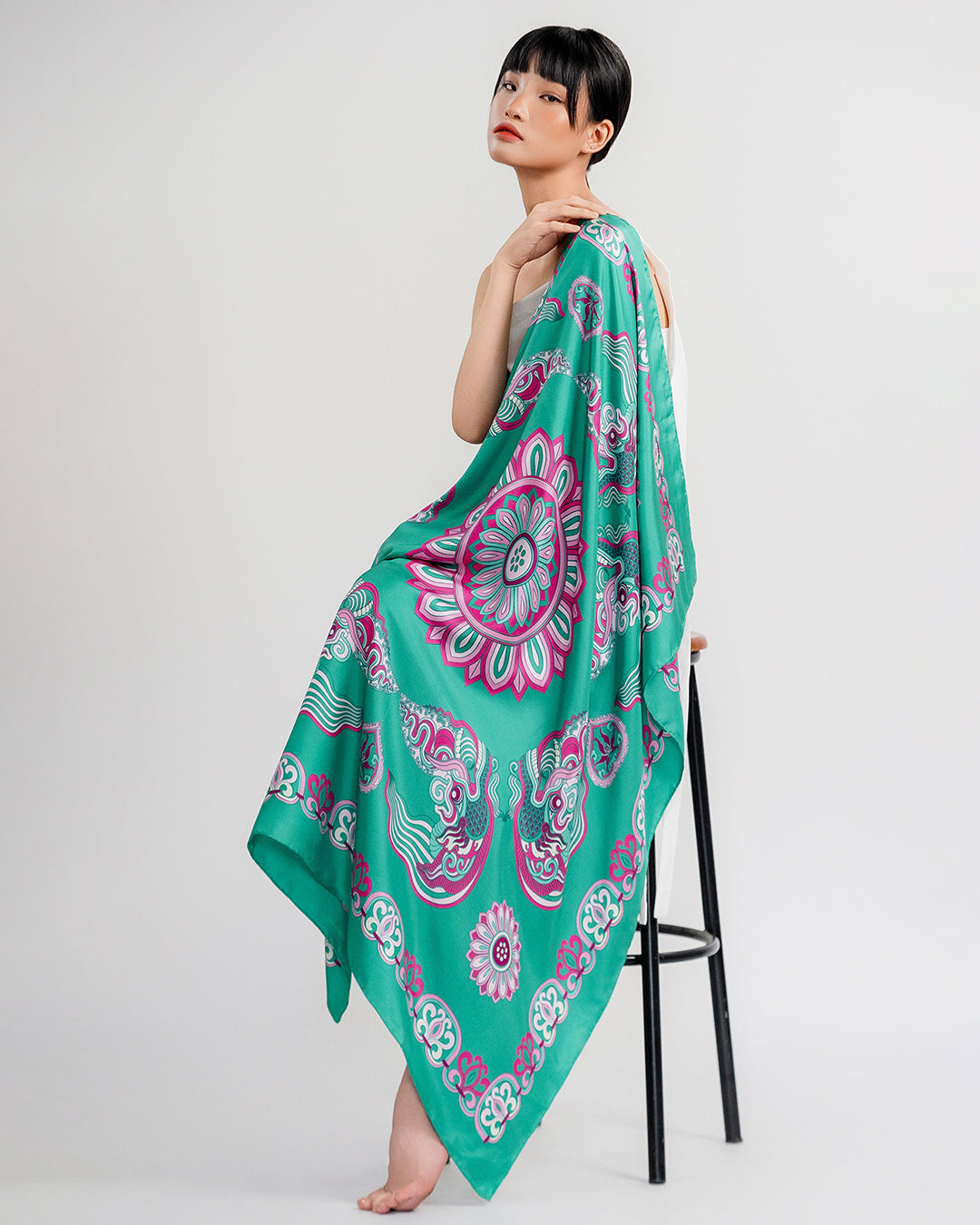 Inspired by thousand-year history of Thang Long Citadel, "Dragon of Grace" print is designed from ancient artifacts of Ly Dynasty such as dragon, border carvings, carved bodhi leaves, and lotus thrones, each relic embodying the distinct essence of Buddhism. These elements blend seamlessly, evoking a mystical realm between reality and dreams, past and present—where celestial dragons converge, imprinting heritage’s timeless beauty onto the scarves of our time.