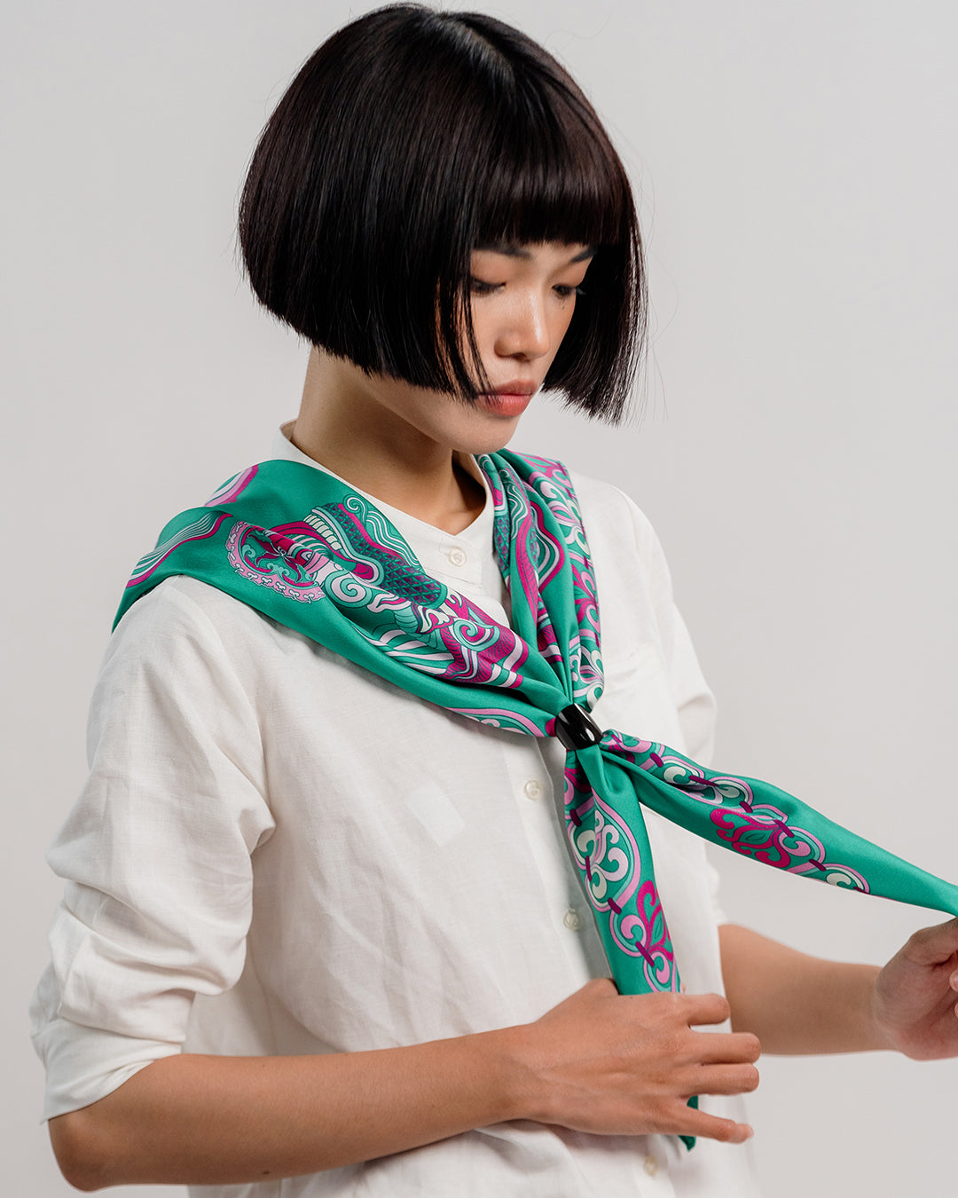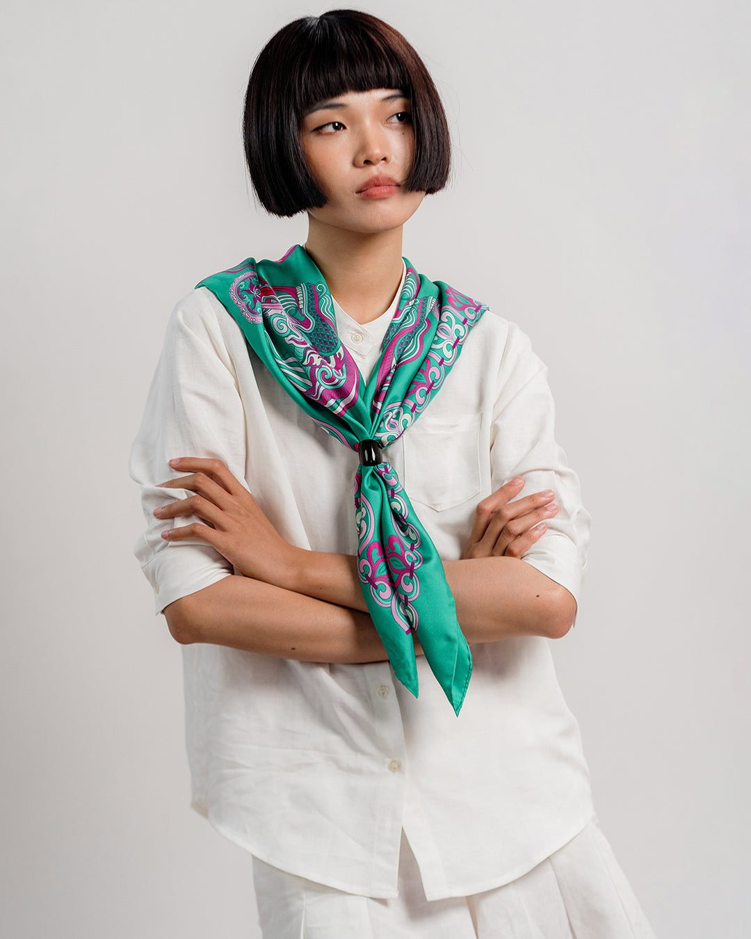 Folk Form proudly presents the silk scarf featuring the "Dragon of Grace" print—a design from the Lý Dynasty - The Chronicles collection. More than just a fashion accessory, it is a symbol of Vietnam’s cultural essence. Each silk thread weaves a thousand-year story, embodying the brand’s dedication, crafting a precious gem that represents an enduring heritage—where tradition and modern creativity intertwine, bringing forth a graceful, meaningful beauty.