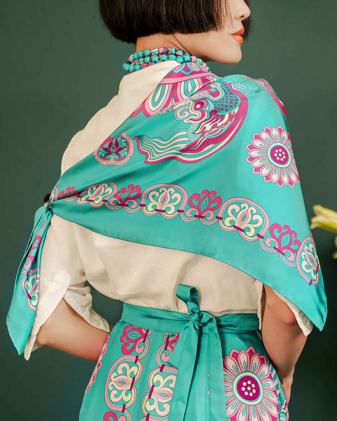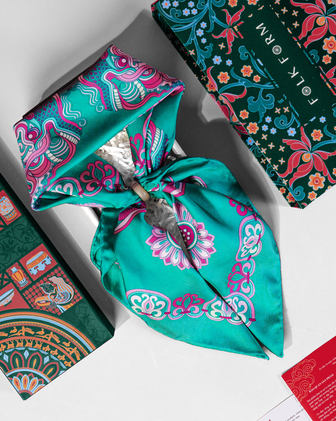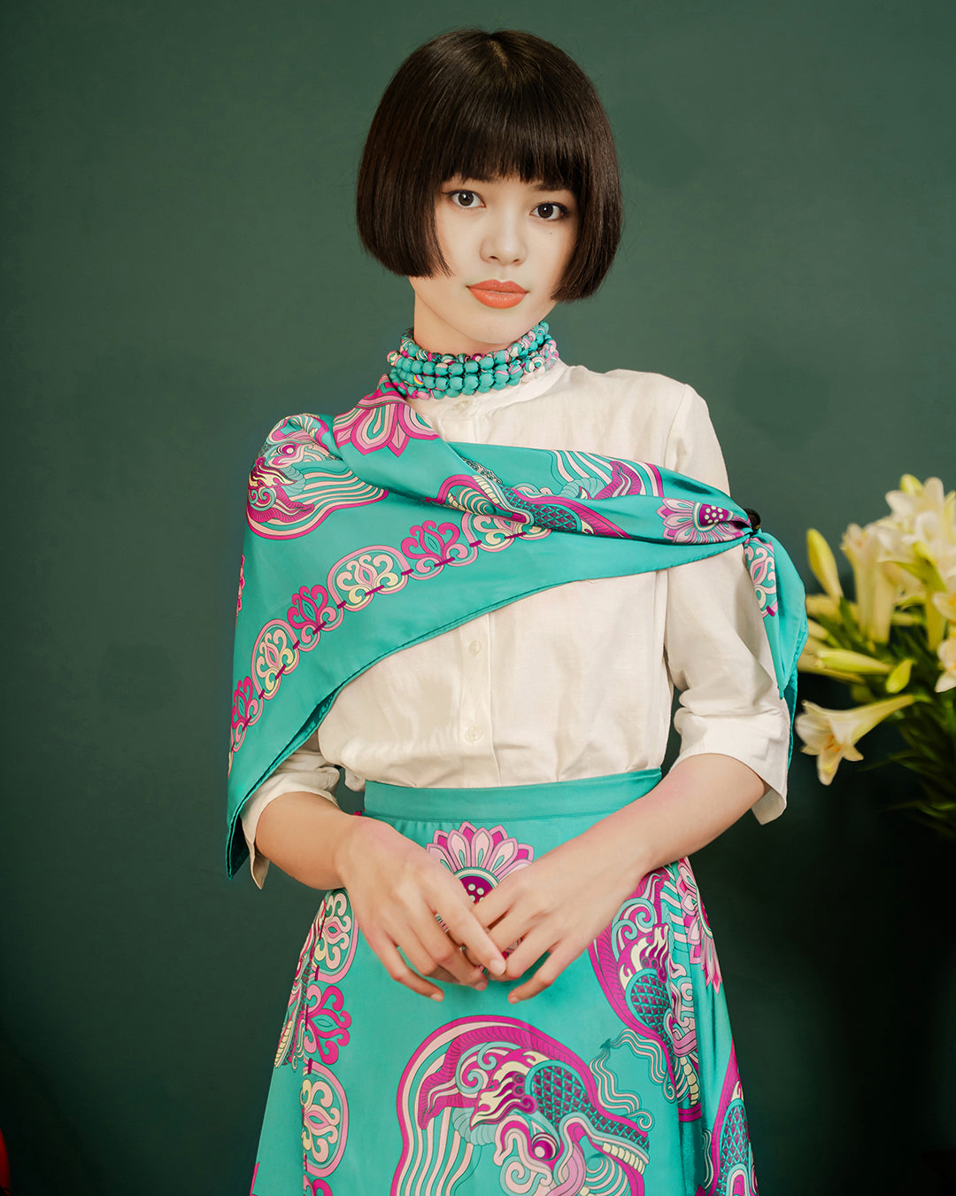 Folk Form proudly presents the silk scarf featuring the "Dragon of Grace" print—a design from the Lý Dynasty - The Chronicles collection. More than just a fashion accessory, it is a symbol of Vietnam’s cultural essence. Each silk thread weaves a thousand-year story, embodying the brand’s dedication, crafting a precious gem that represents an enduring heritage—where tradition and modern creativity intertwine, bringing forth a graceful, meaningful beauty.
