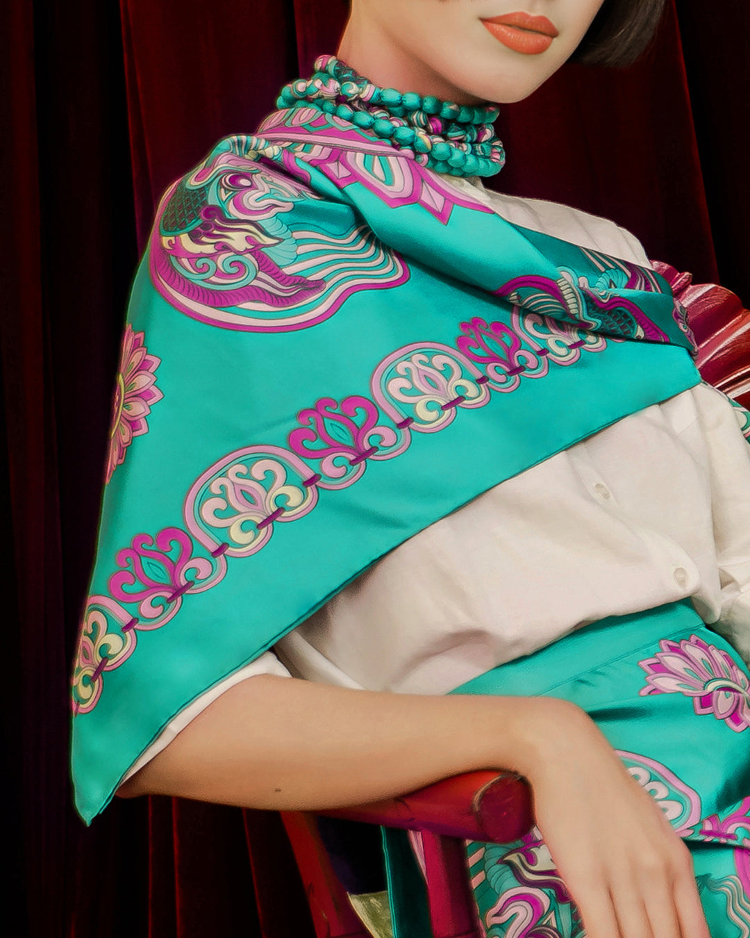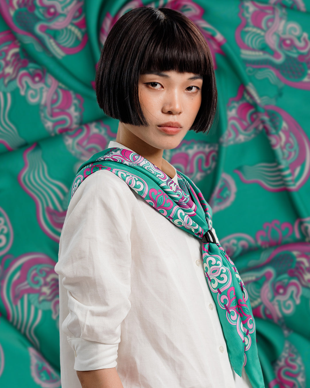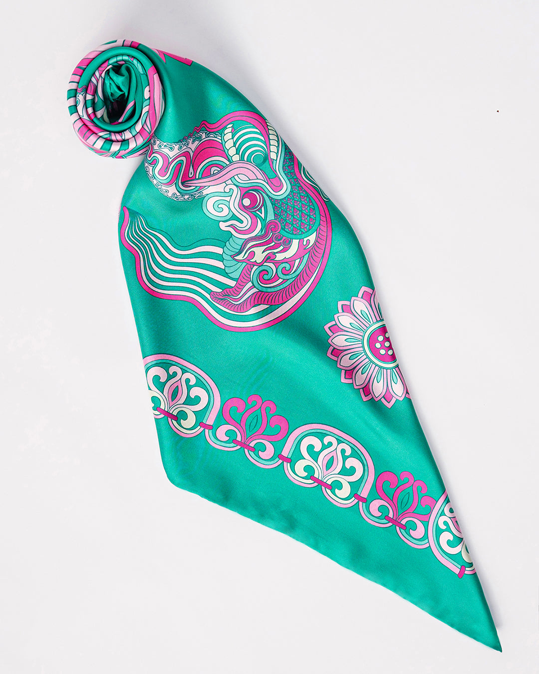 Inspired by Vietnamese royal heritage (Asian culture), the "Dragon Of Grace" Silk Scarf features a dragon—a timeless symbol of strength, wisdom, and good fortune.