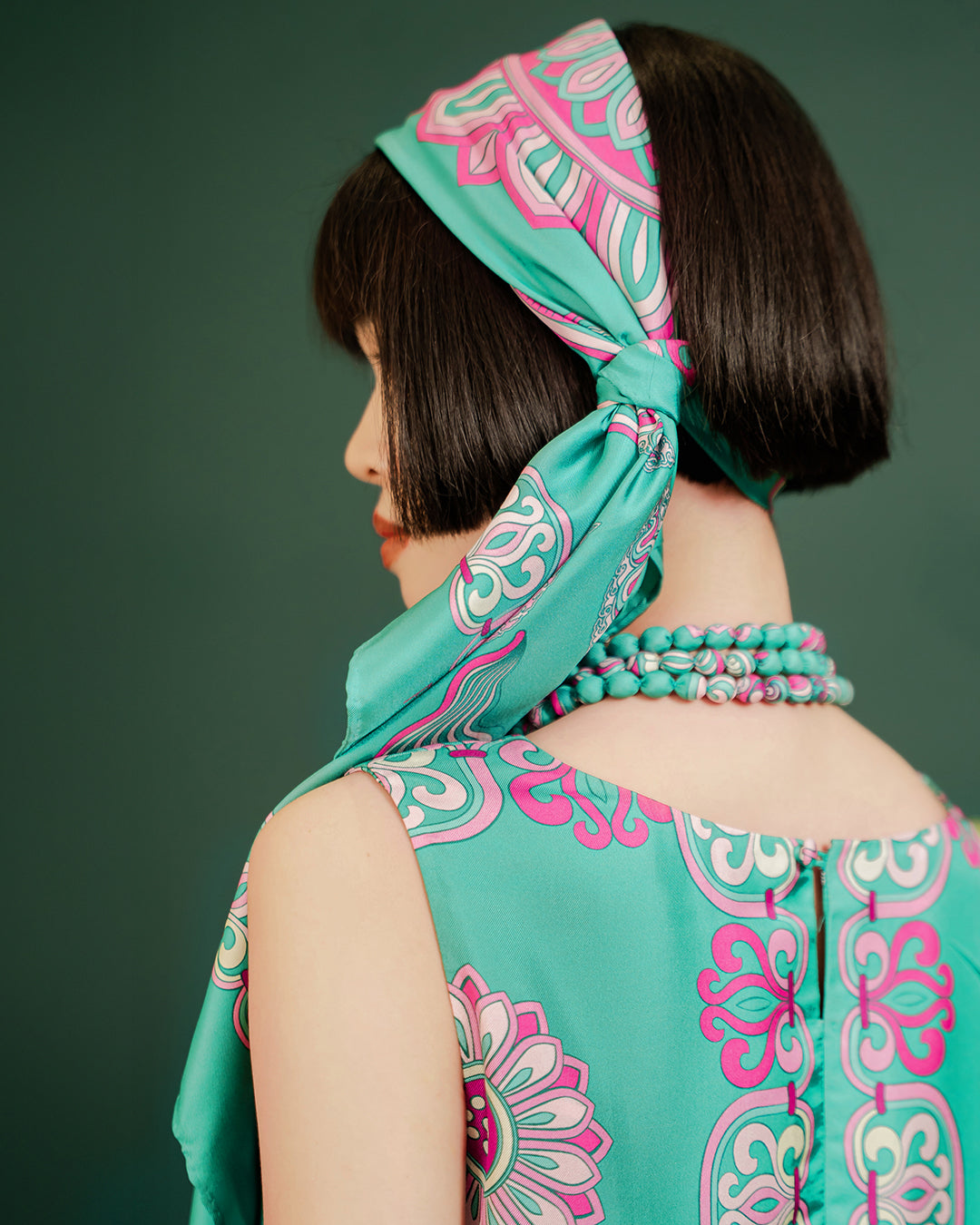 Folk Form's turquoise silk scarf adds a touch of luxury and offers natural moisture retention, breathability, and gentle softness. Perfect for sensitive skin, it reduces friction, hair breakage, and frizz, enhancing shine. Style it any way you want in your own mood and creativity!