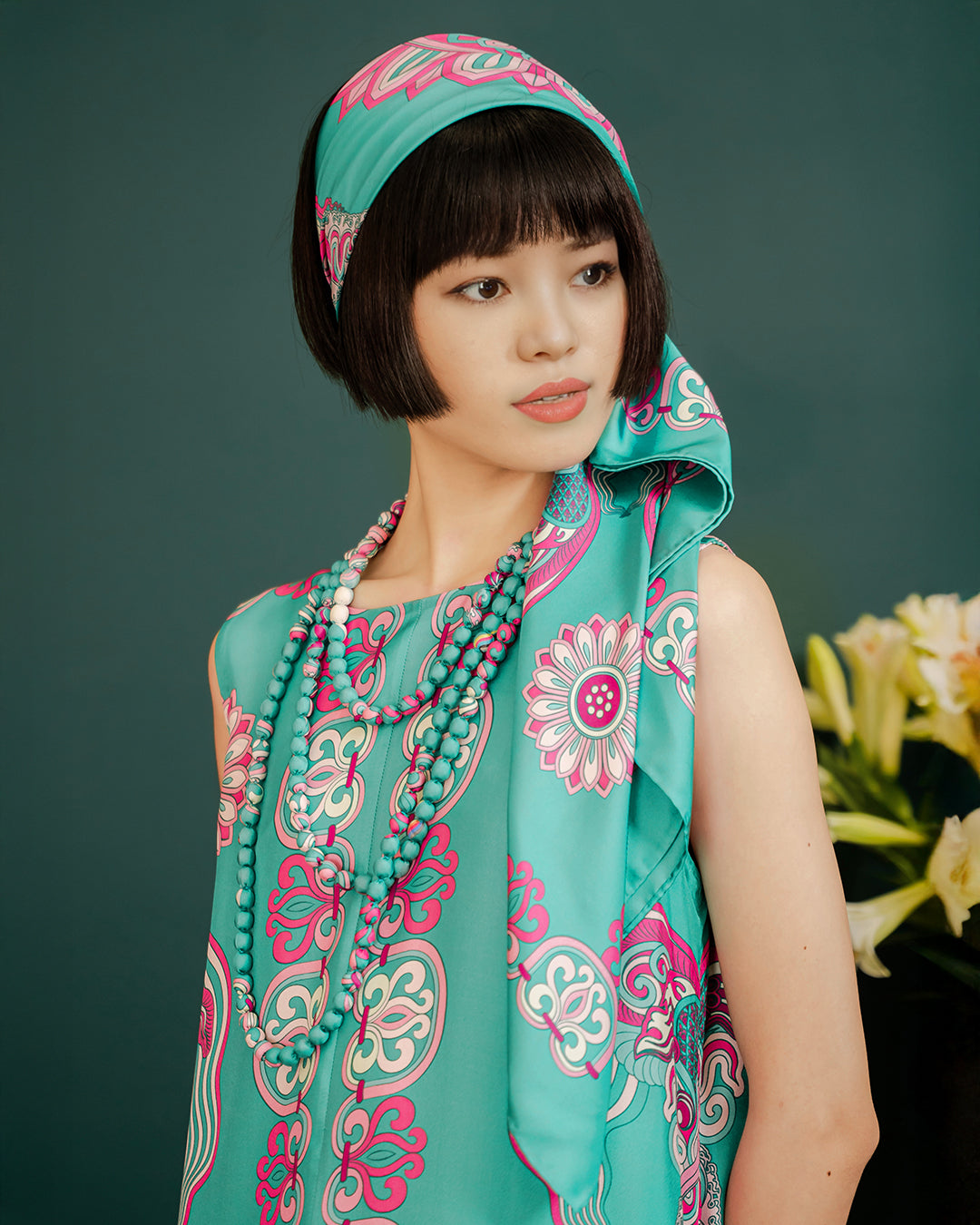 Inspired by thousand-year history of Thang Long Citadel, "Dragon of Grace" print is designed from ancient artifacts of Ly Dynasty such as dragon, border carvings, carved bodhi leaves, and lotus thrones, each relic embodying the distinct essence of Buddhism. These elements blend seamlessly, evoking a mystical realm between reality and dreams, past and present—where celestial dragons converge, imprinting heritage’s timeless beauty onto the scarves of our time.