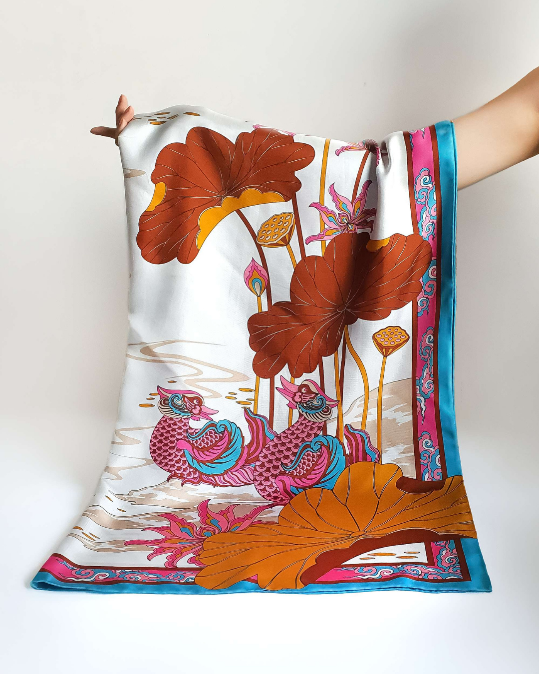 Inspired by Vietnam’s Ly-Tran dynasty heritage, the Lotus Serenade Silk Scarf features a pair of mandarin ducks and a blooming lotus - symbols of eternal love, purity, and lasting happiness.
