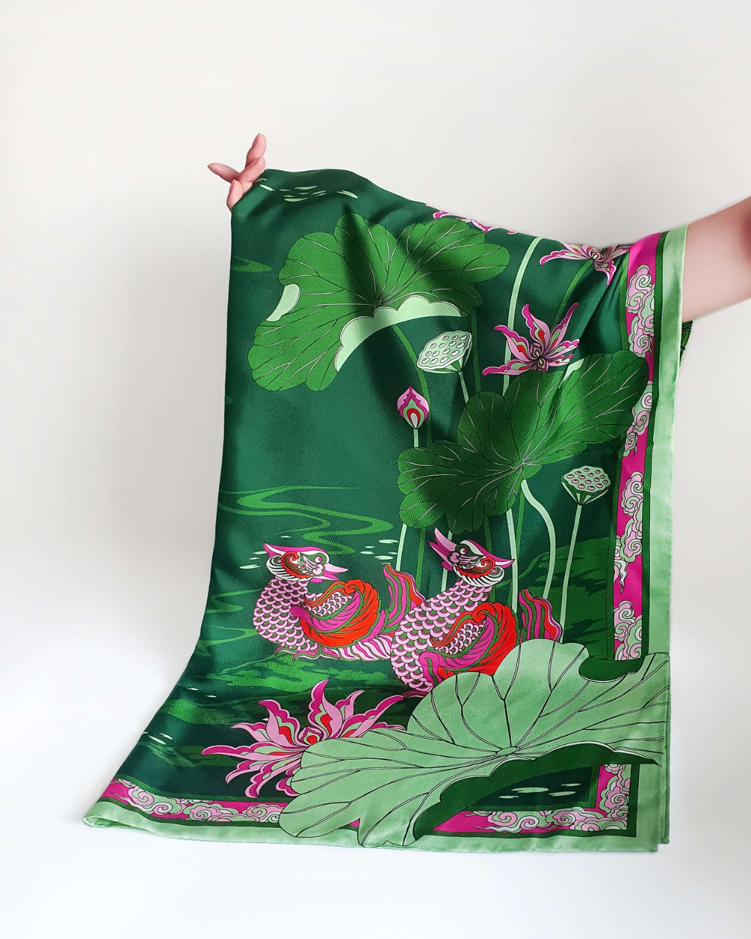 Inspired by Vietnam’s Ly-Tran dynasty heritage, the Lotus Serenade Silk Scarf features a pair of mandarin ducks and a blooming lotus - symbols of eternal love, purity, and lasting happiness.