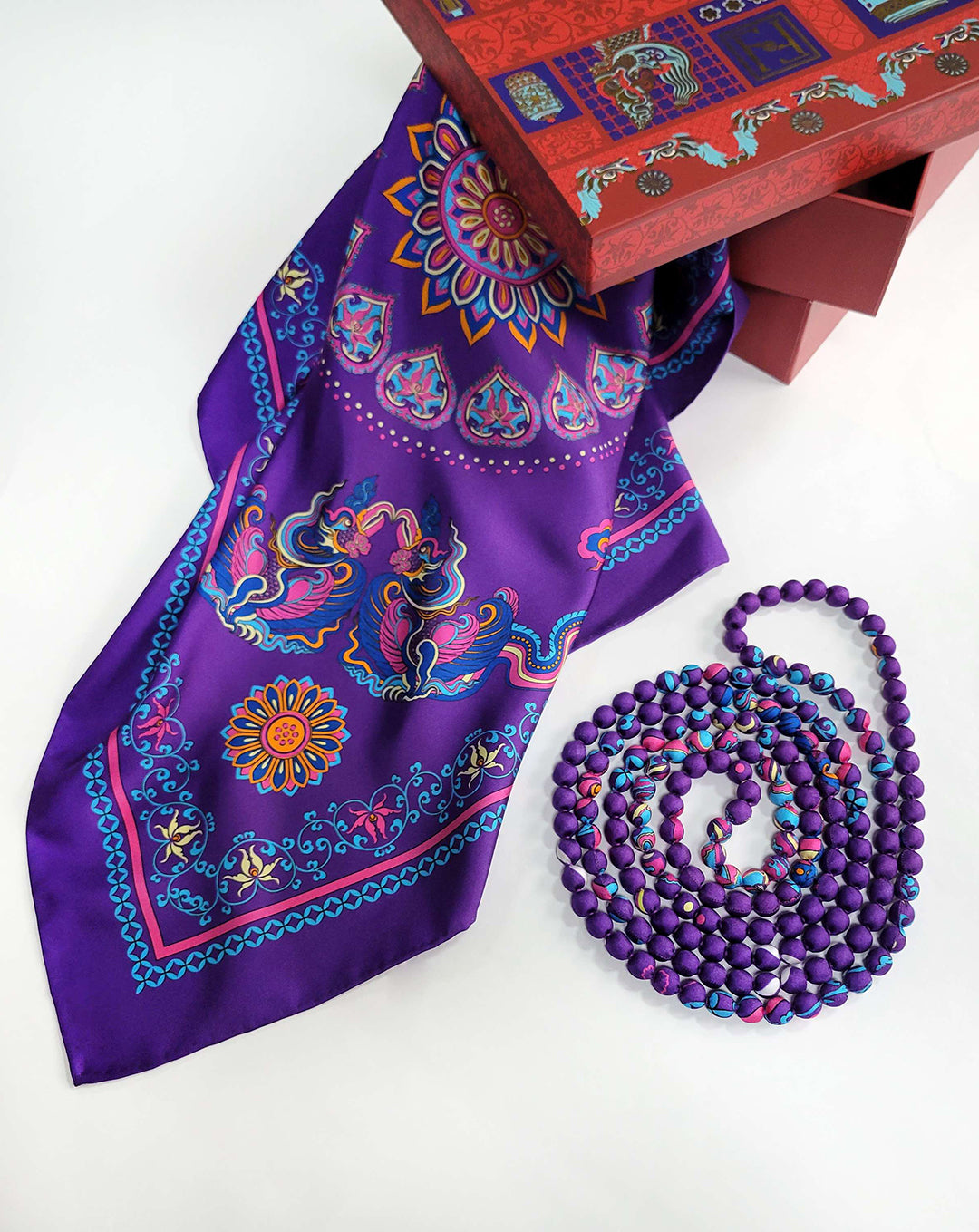 The Phoenix motif unfolds with wide-spread wings, gracefully curved, layered feathers, interwoven with cloud patterns and Bodhi leaves, creating a harmonious, balanced composition. Bordering this celestial scene is a flowing lotus motif, interlaced with lime flower chain and a ribbon of color. The palette of the scarves blends warm and refreshing tones, from pastel pink to mystical purple, evoking a sense of antiquity, elegance, vibrancy and modern sophistication.