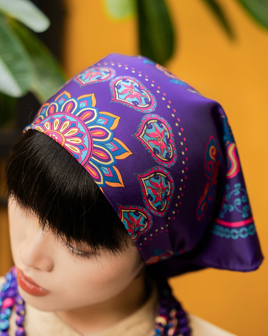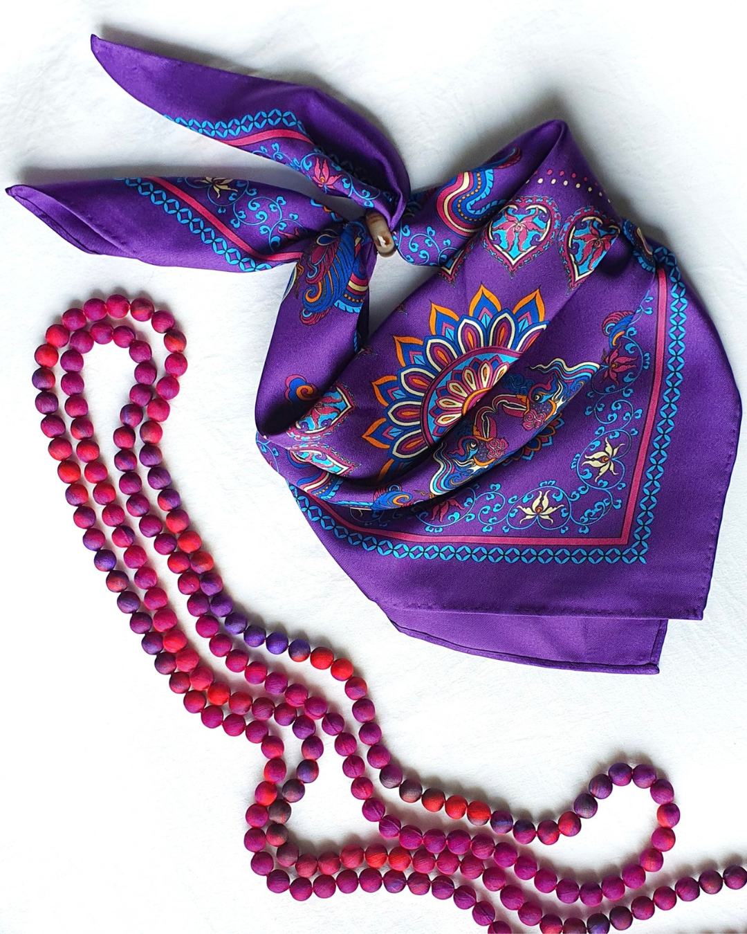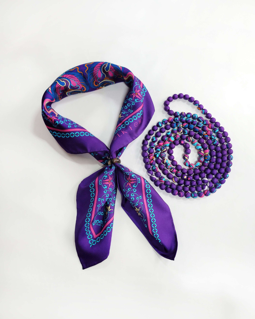Folk Form's purple silk scarf adds a touch of luxury and offers natural moisture retention, breathability, and gentle softness. Perfect for sensitive skin, it reduces friction, hair breakage, and frizz, enhancing shine. Style it any way you want in your own mood and creativity!