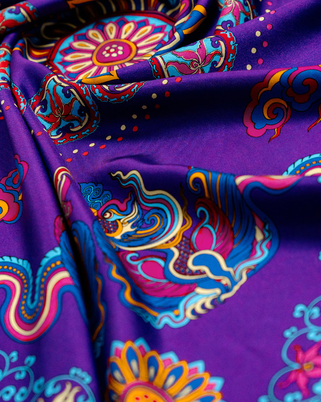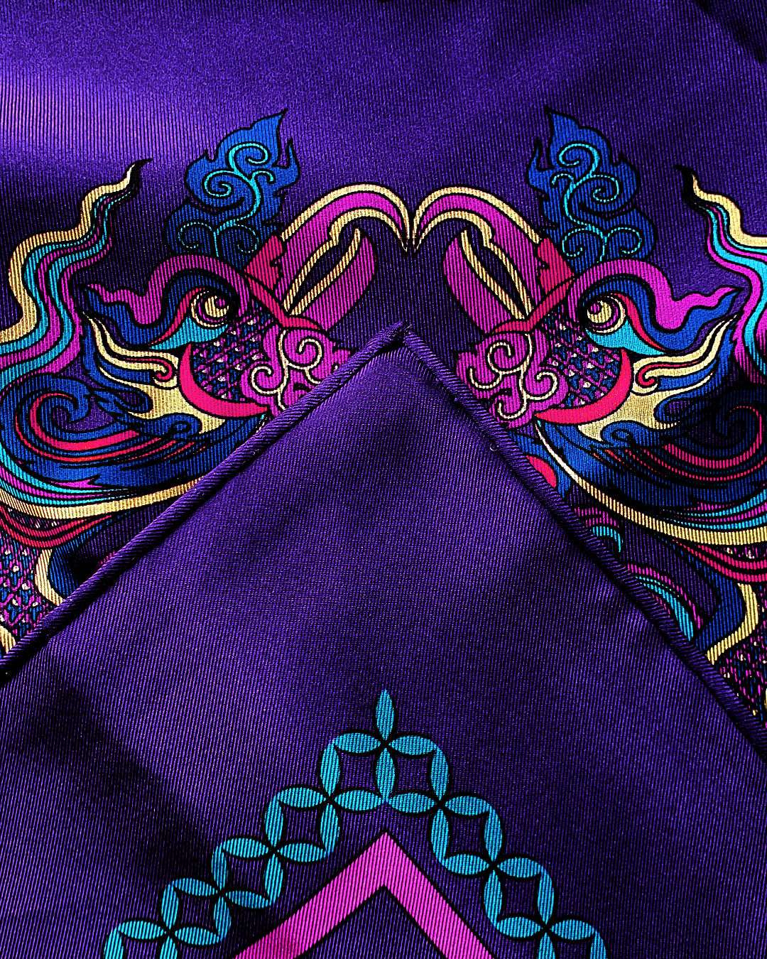 The Phoenix motif unfolds with wide-spread wings, gracefully curved, layered feathers, interwoven with cloud patterns and Bodhi leaves, creating a harmonious, balanced composition. Bordering this celestial scene is a flowing lotus motif, interlaced with lime flower chain and a ribbon of color. The palette of the scarves blends warm and refreshing tones, from pastel pink to mystical purple, evoking a sense of antiquity, elegance, vibrancy and modern sophistication.
