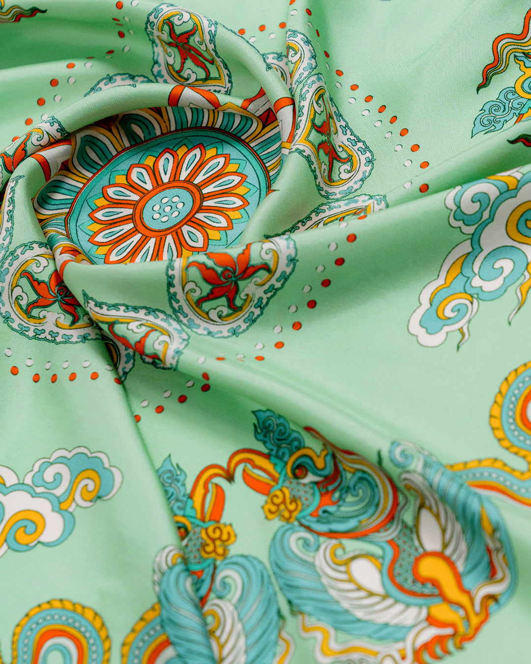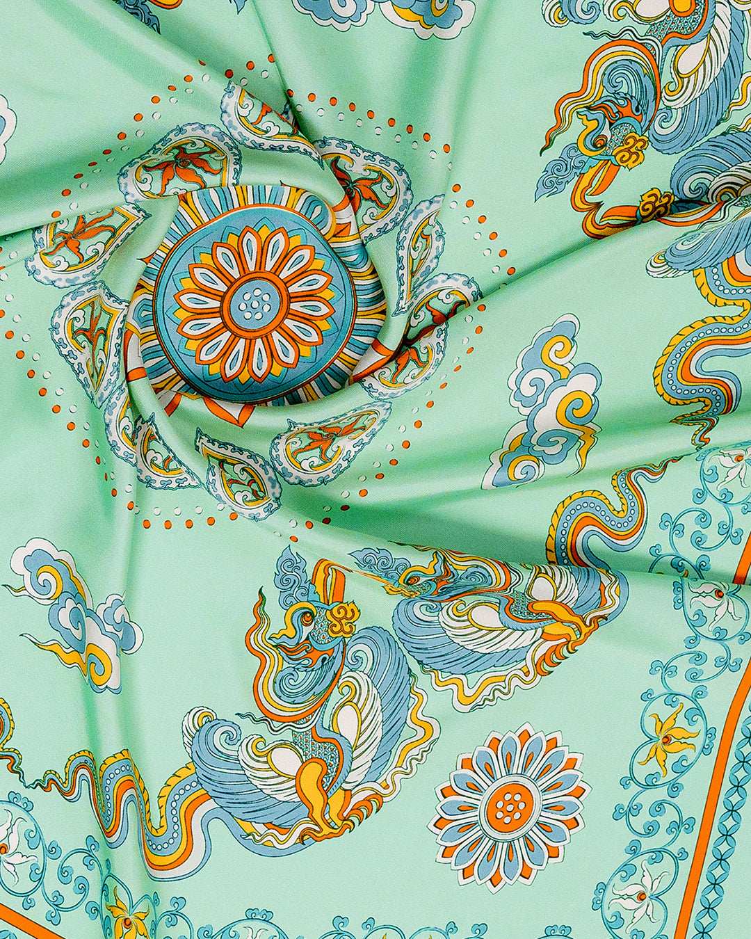 The Phoenix motif unfolds with wide-spread wings, gracefully curved, layered feathers, interwoven with cloud patterns and Bodhi leaves, creating a harmonious, balanced composition. Bordering this celestial scene is a flowing lotus motif, interlaced with lime flower chain and a ribbon of color. The palette of the scarves blends warm and refreshing tones, from pastel pink to mystical purple, evoking a sense of antiquity, elegance, vibrancy and modern sophistication.