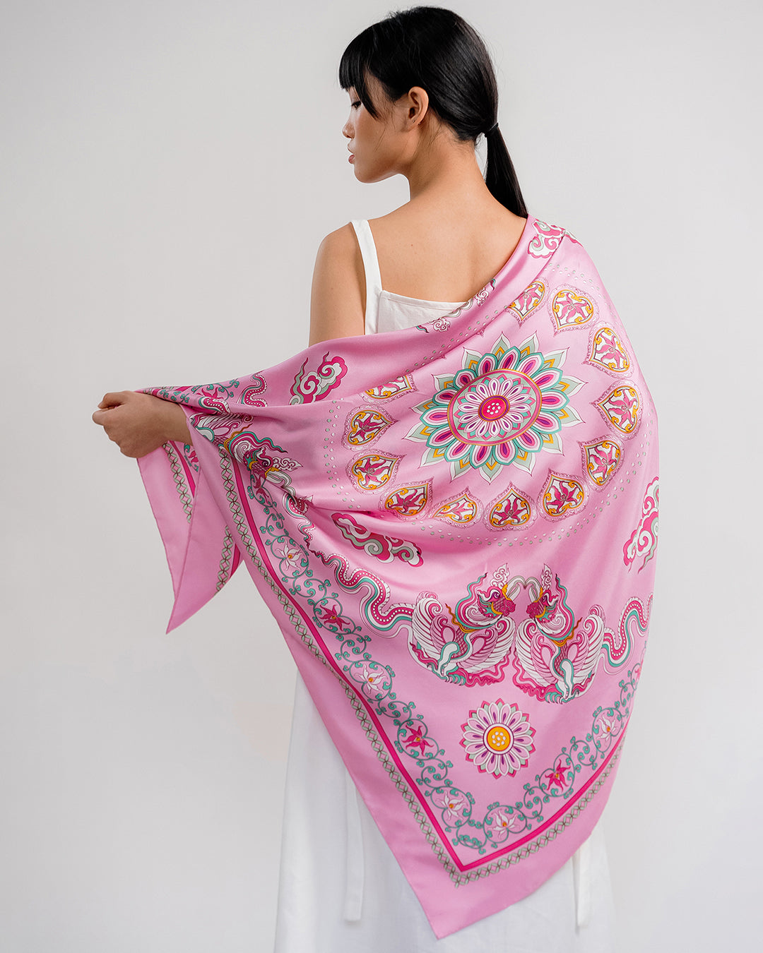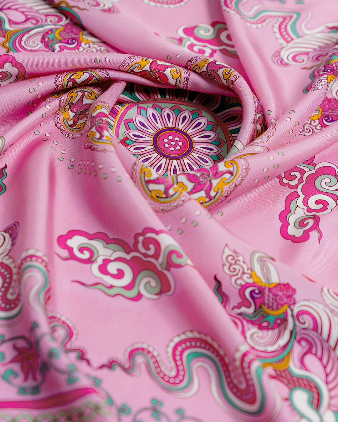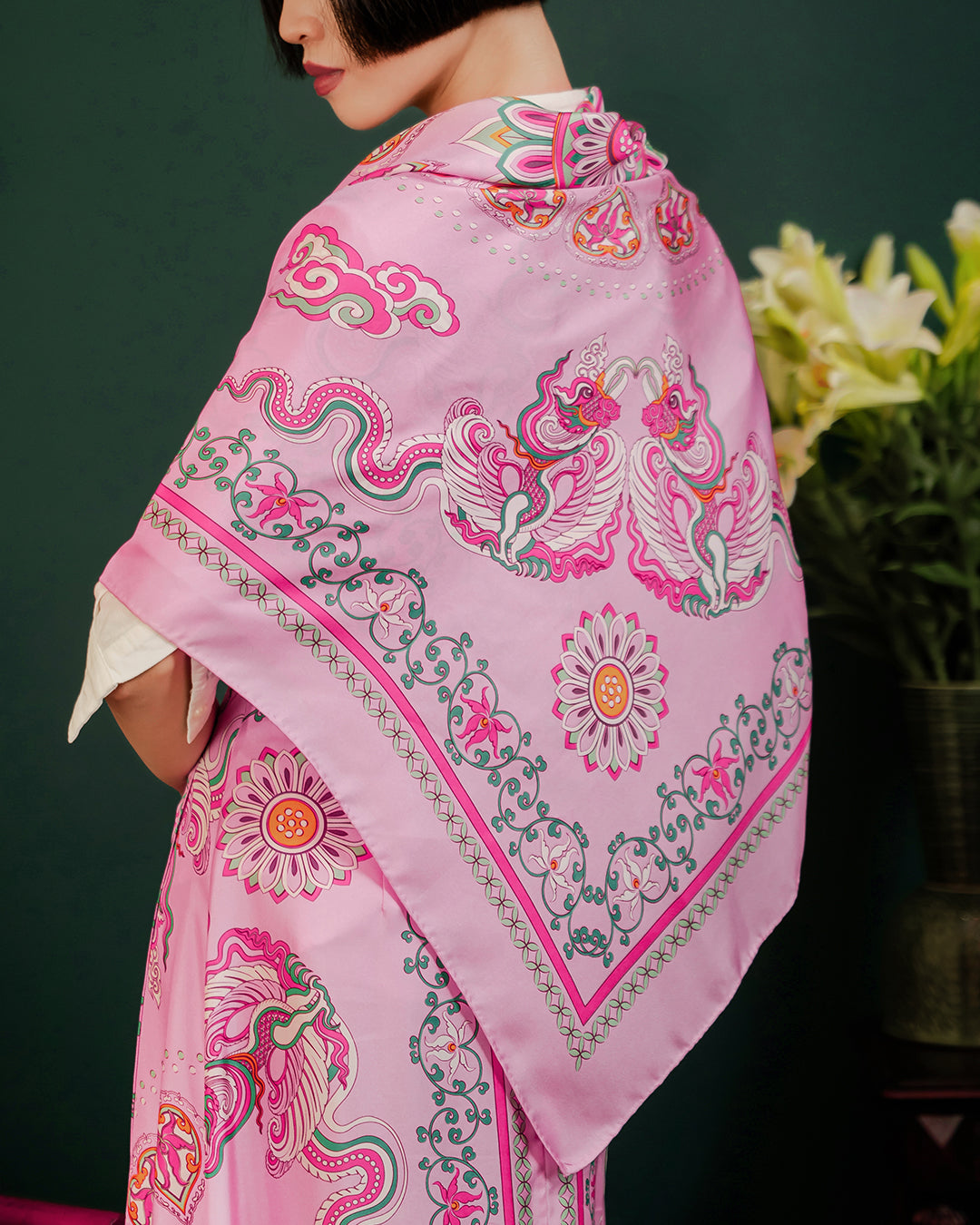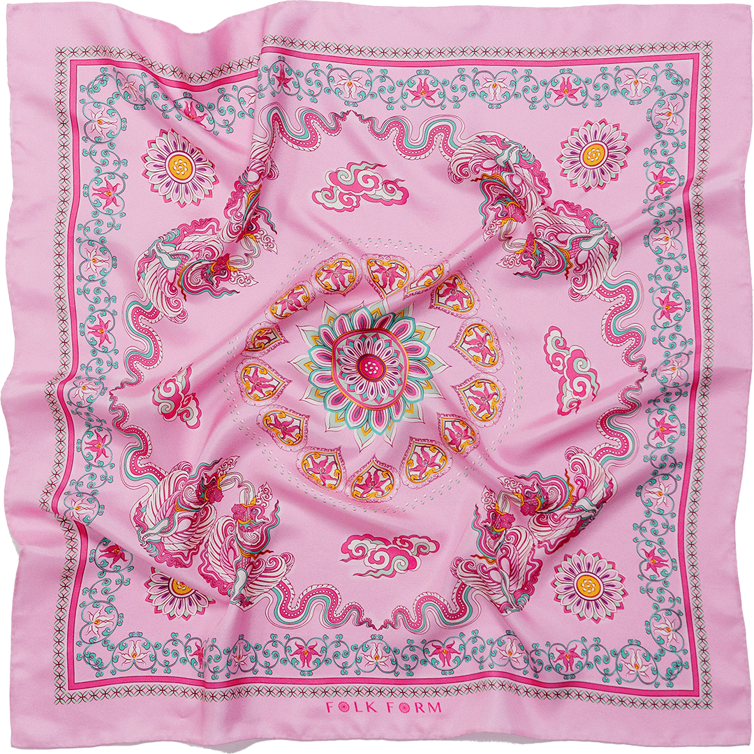 The Phoenix motif unfolds with wide-spread wings, gracefully curved, layered feathers, interwoven with cloud patterns and Bodhi leaves, creating a harmonious, balanced composition. Bordering this celestial scene is a flowing lotus motif, interlaced with lime flower chain and a ribbon of color. The palette of the scarves blends warm and refreshing tones, from pastel pink to mystical purple, evoking a sense of antiquity, elegance, vibrancy and modern sophistication.