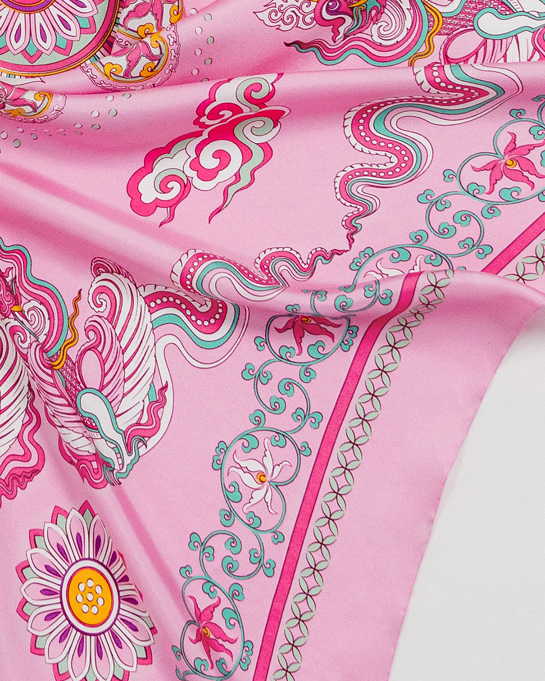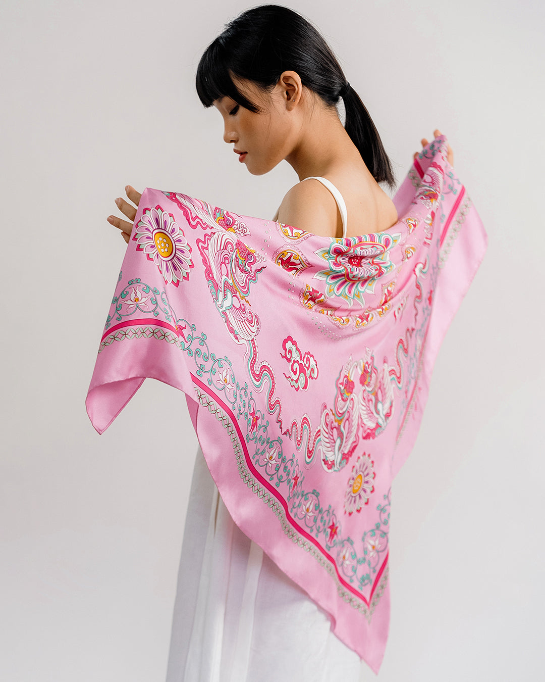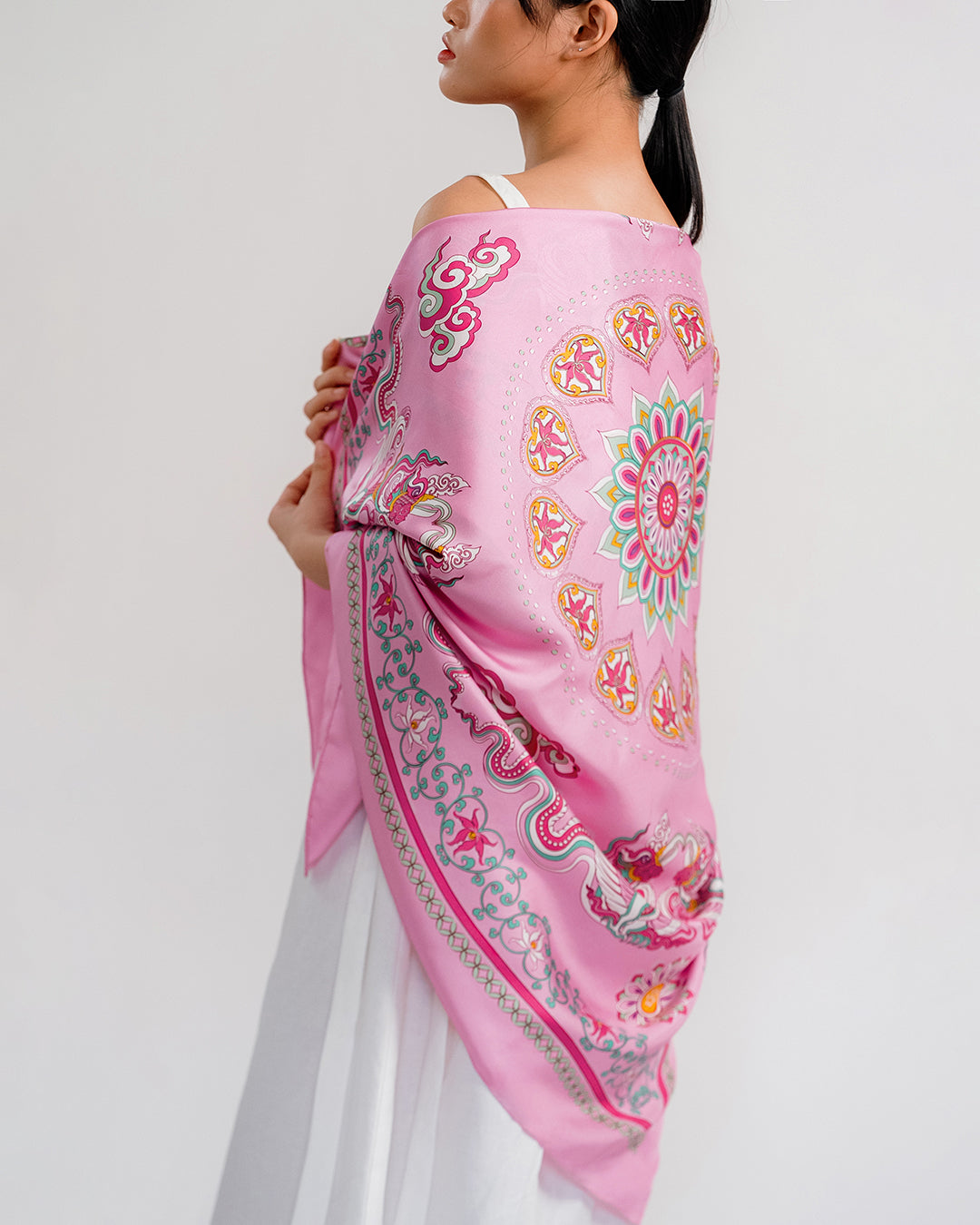The Phoenix motif unfolds with wide-spread wings, gracefully curved, layered feathers, interwoven with cloud patterns and Bodhi leaves, creating a harmonious, balanced composition. Bordering this celestial scene is a flowing lotus motif, interlaced with lime flower chain and a ribbon of color. The palette of the scarves blends warm and refreshing tones, from pastel pink to mystical purple, evoking a sense of antiquity, elegance, vibrancy and modern sophistication.