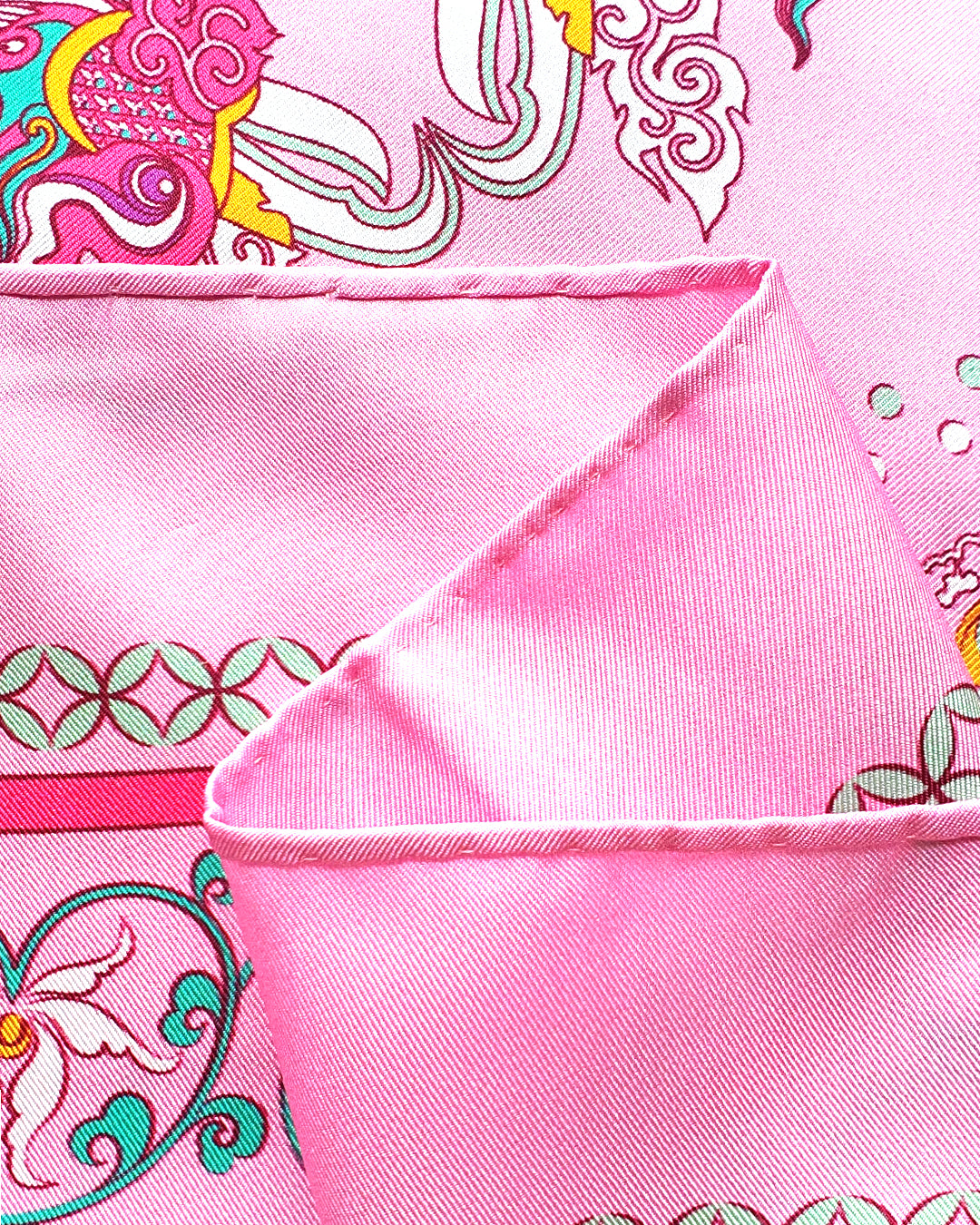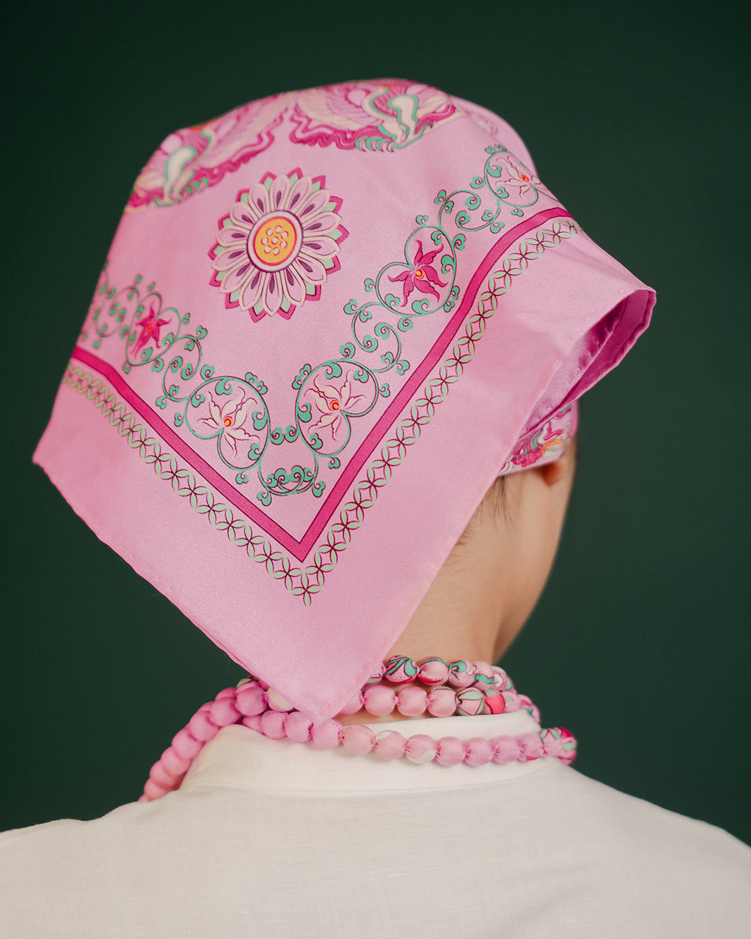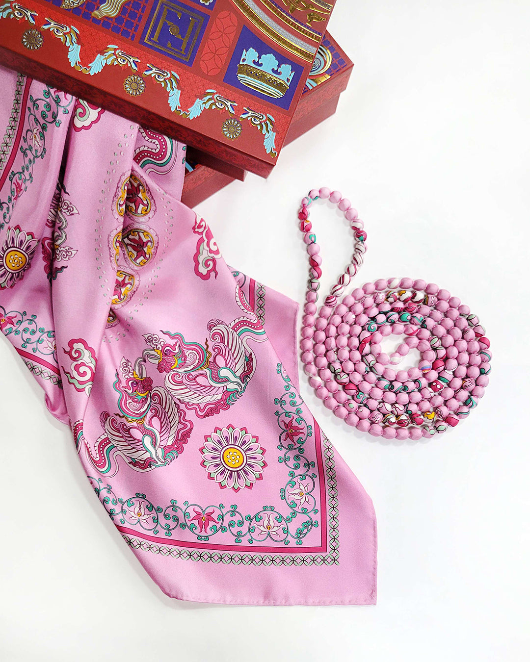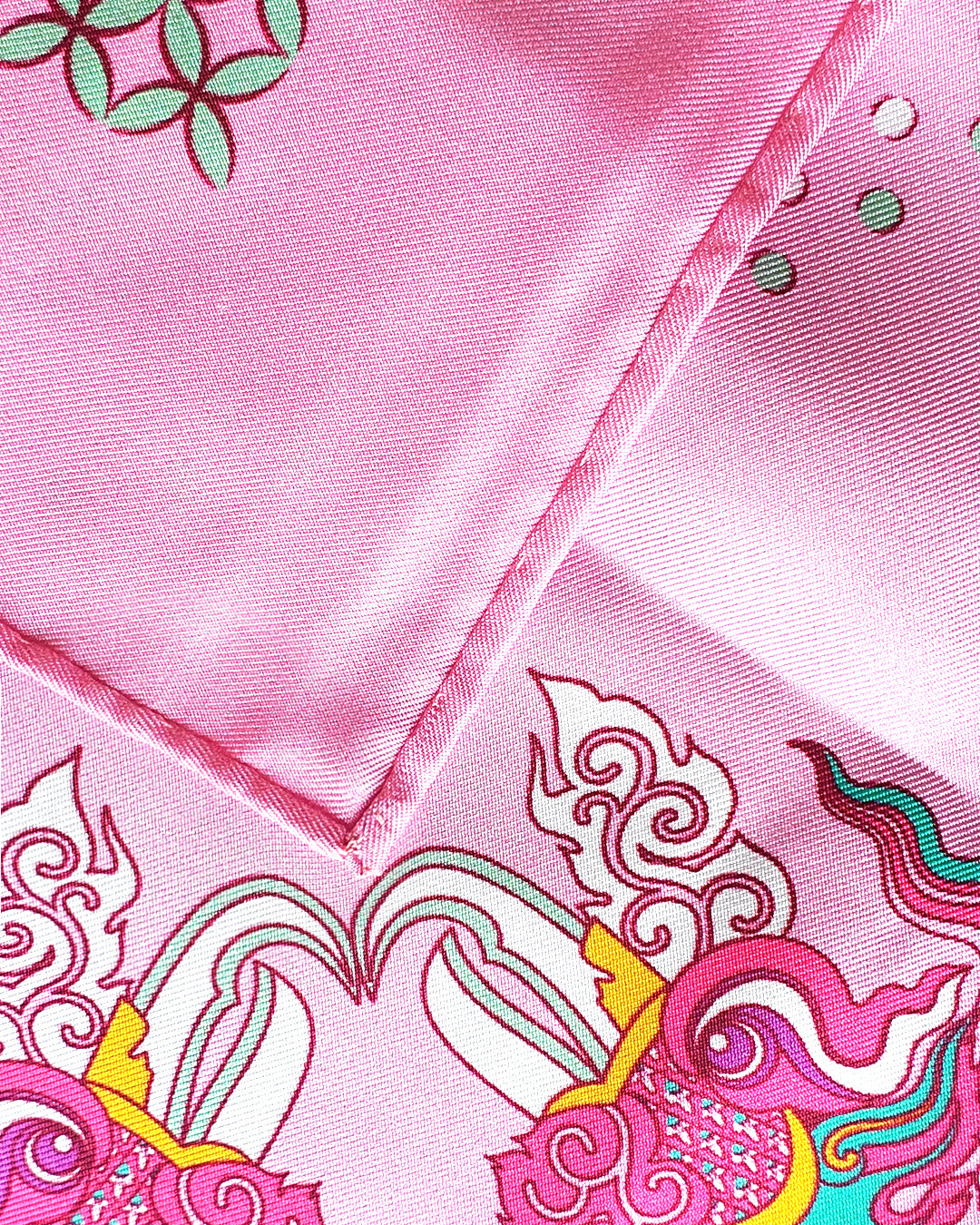 The Phoenix motif unfolds with wide-spread wings, gracefully curved, layered feathers, interwoven with cloud patterns and Bodhi leaves, creating a harmonious, balanced composition. Bordering this celestial scene is a flowing lotus motif, interlaced with lime flower chain and a ribbon of color. The palette of the scarves blends warm and refreshing tones, from pastel pink to mystical purple, evoking a sense of antiquity, elegance, vibrancy and modern sophistication.