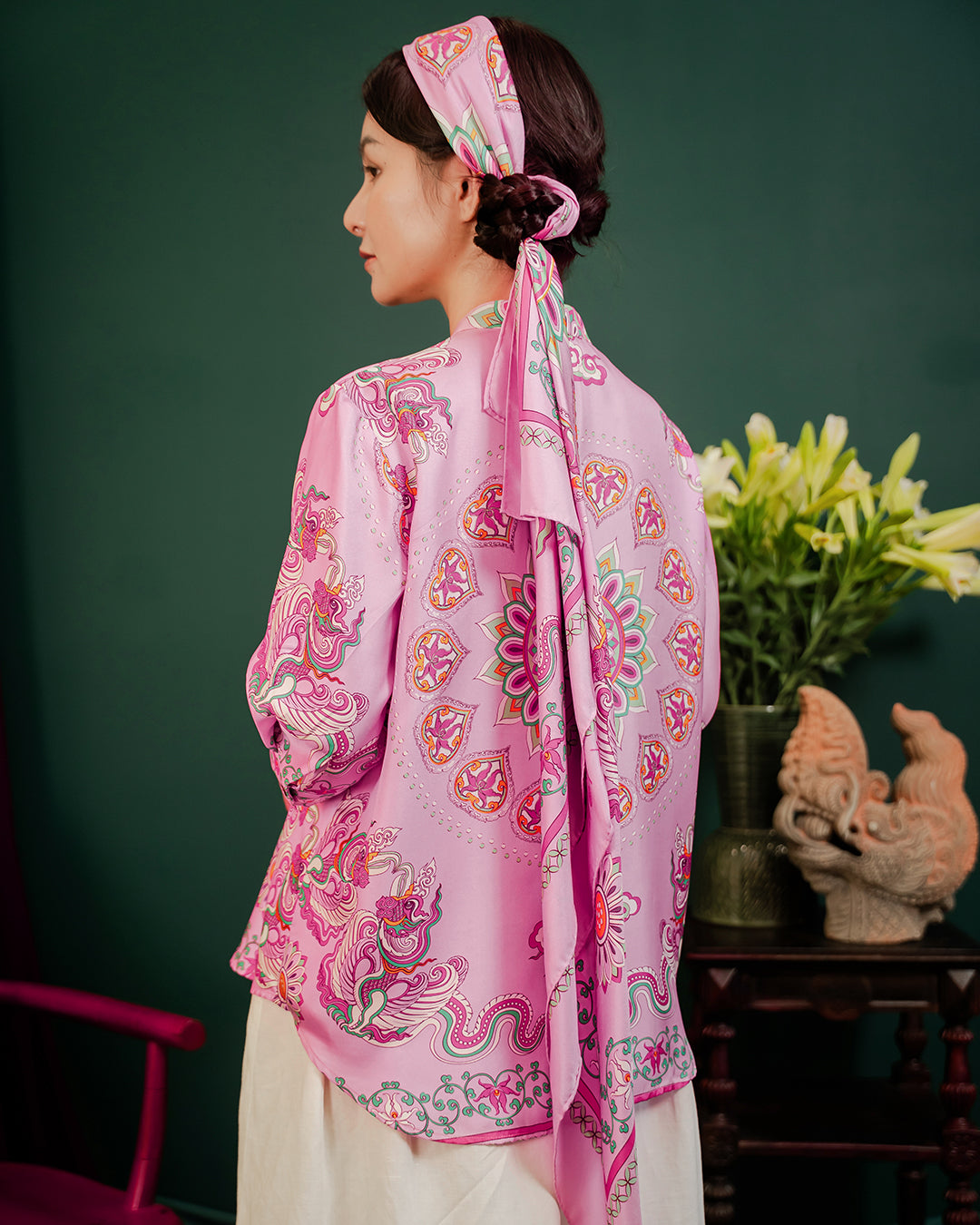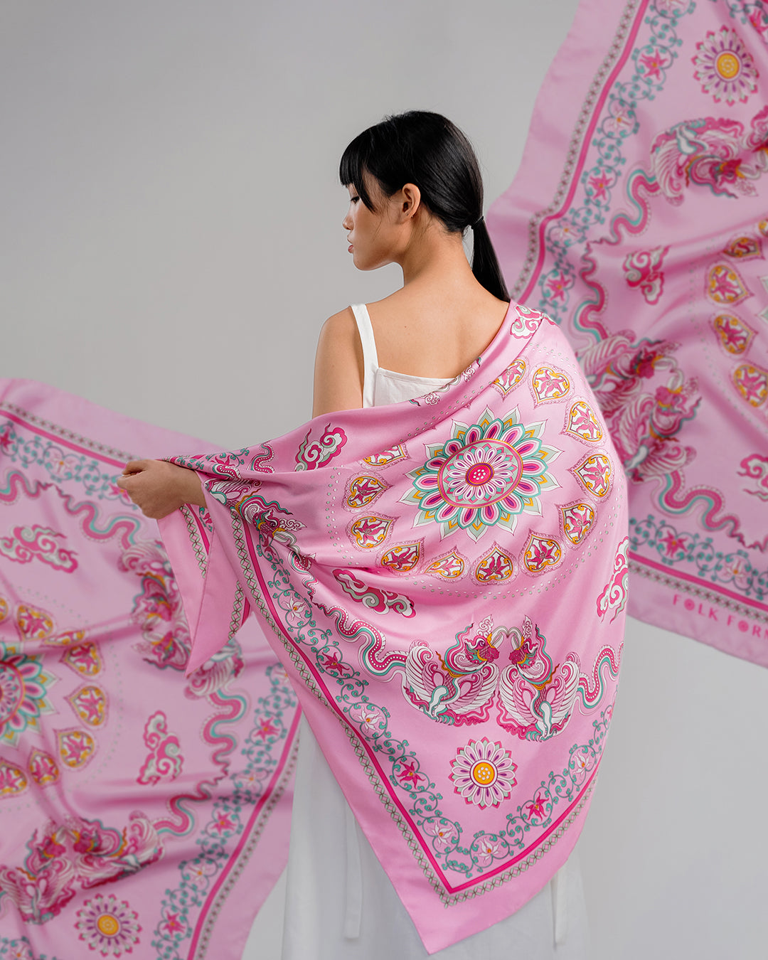 Folk Form proudly presents the silk scarf featuring the "Phoenix Dance" print – a collection that reimagines the beauty of the Phoenix, a sacred creature symbolizing the Empress, femininity, nobility, and virtue in Đại Việt culture. Each silk thread weaves a thousand-year story, embodying the brand’s dedication, crafting a precious gem that represents an enduring heritage—where tradition and modern creativity intertwine, bringing forth a graceful, meaningful beauty.