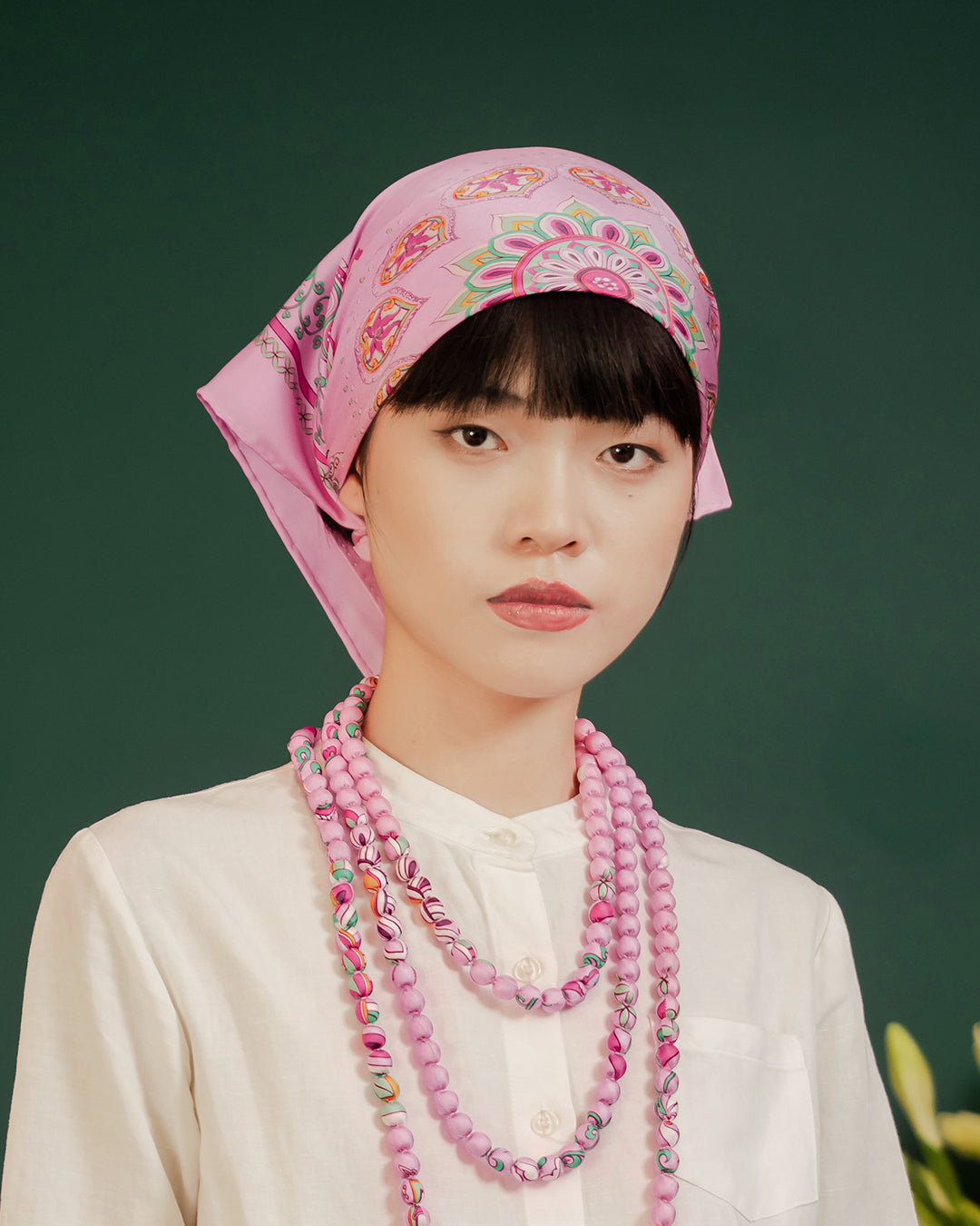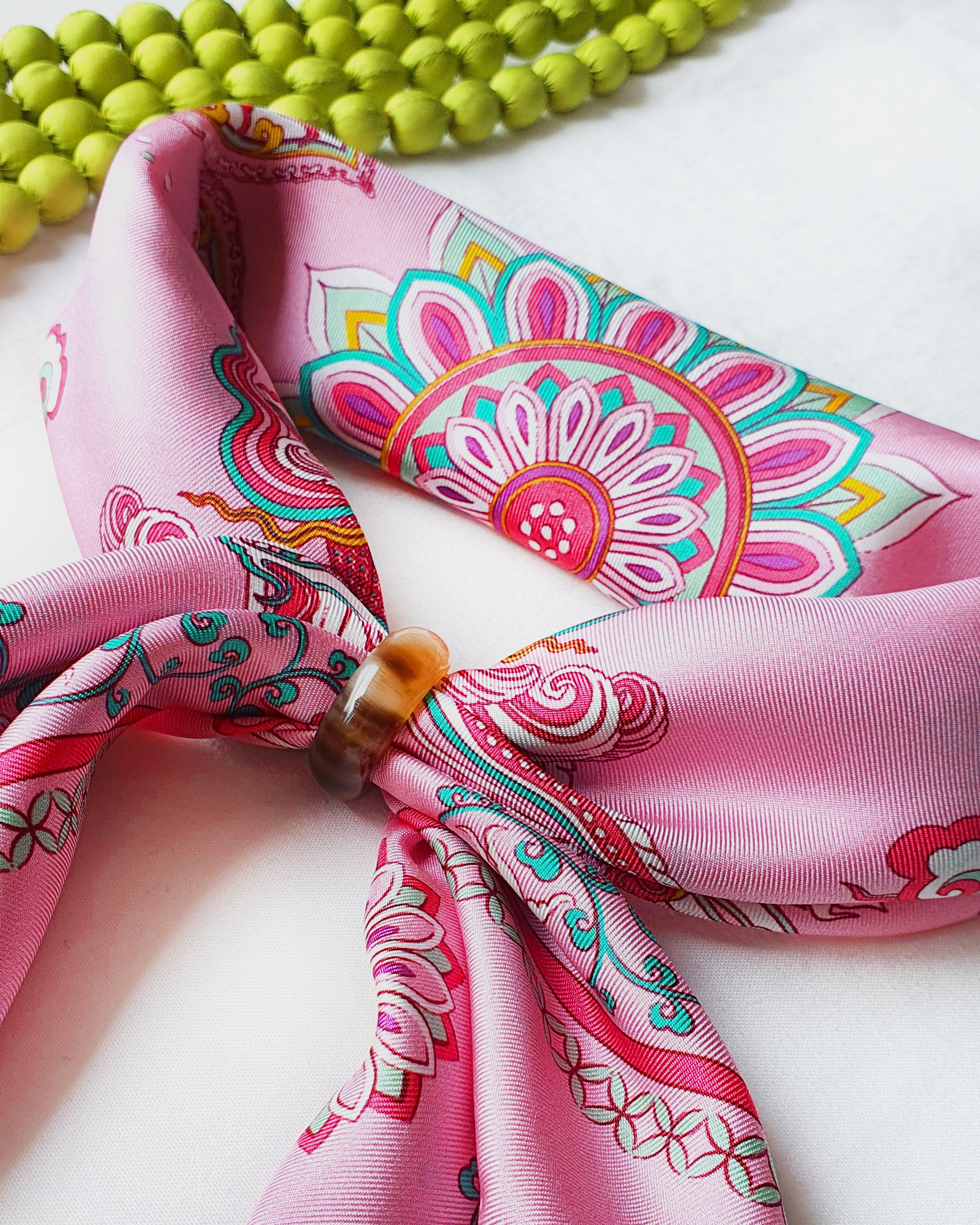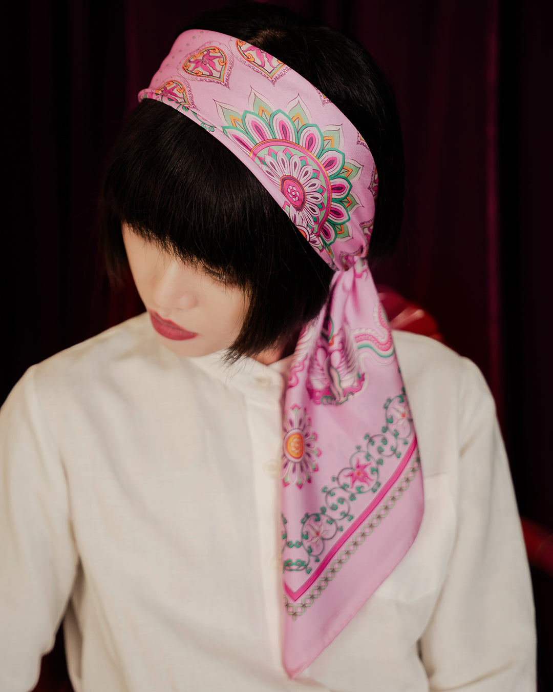 I bought this scarf as a treat after a rough week, and I’m so glad I did. I wore it folded into a triangle and tied behind my neck, like a classic bandana. The pink makes me look more awake and fresh. It’s soft, it’s well-made, and it’s the small joy I needed.