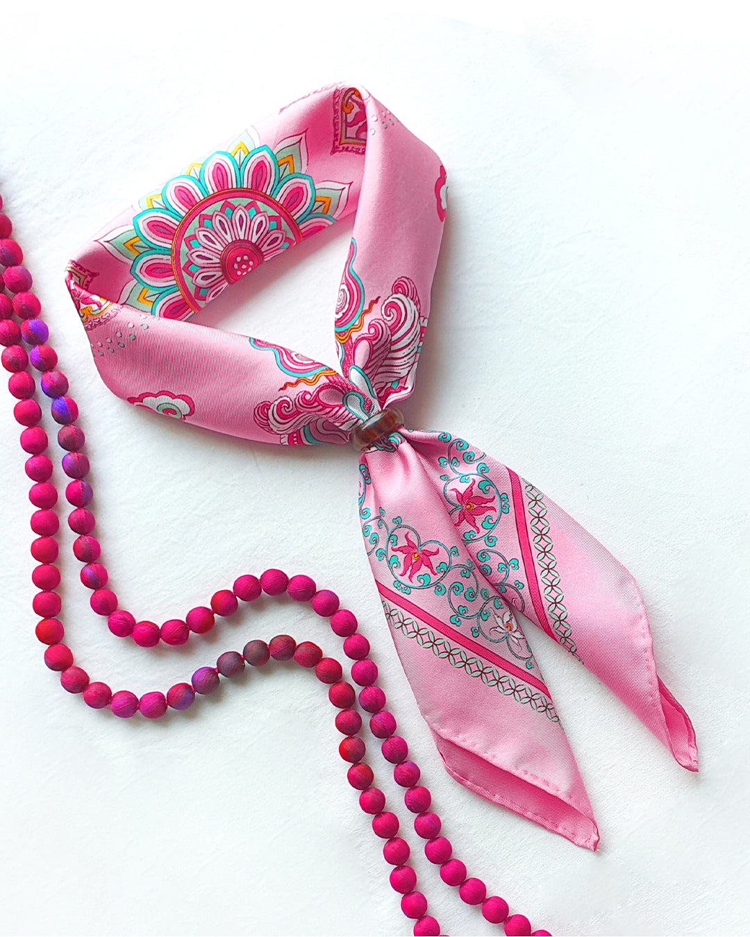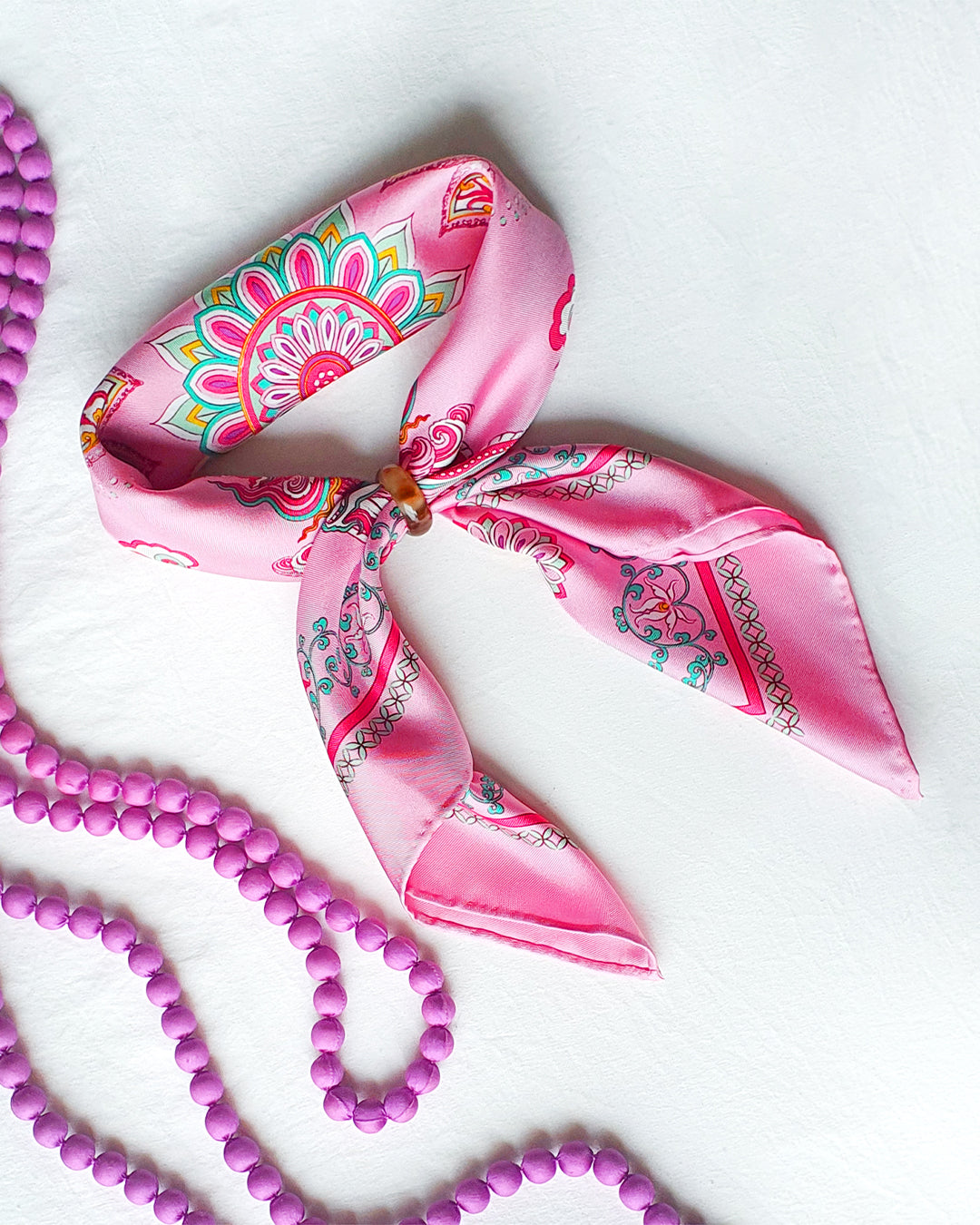 Folk Form's pink silk scarf adds a touch of luxury and offers natural moisture retention, breathability, and gentle softness. Perfect for sensitive skin, it reduces friction, hair breakage, and frizz, enhancing shine. Style it any way you want in your own mood and creativity!