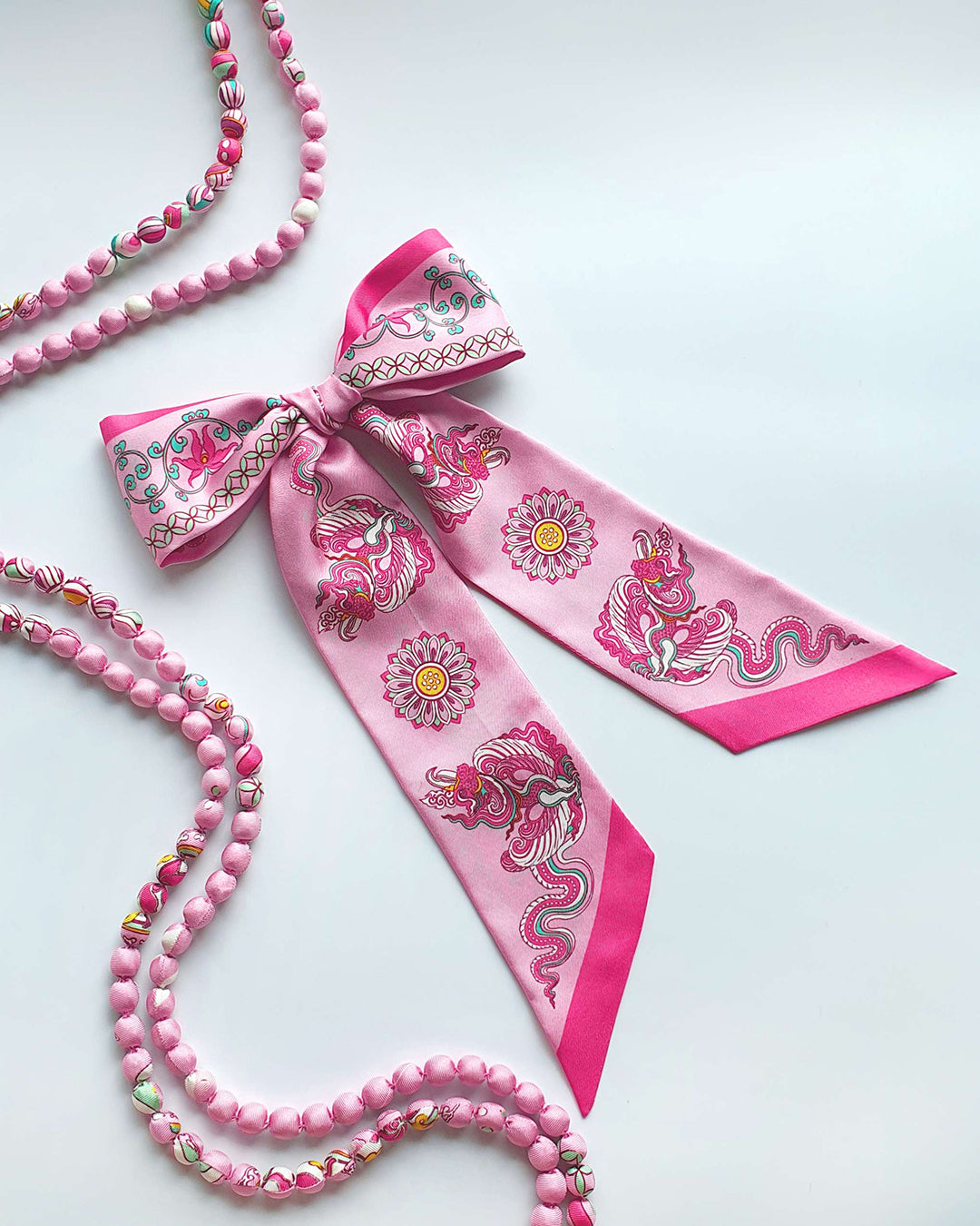 Unlike larger carré scarves, the Twilly offers a lighter, breezier alternative for warmer climates. Style it in various ways—from a simple side knot, a colorful choker tied at the nape, a tidy double wrap (as seen on flight attendants), or even a slender, necktie-inspired drape down the chest for timeless sophistication.