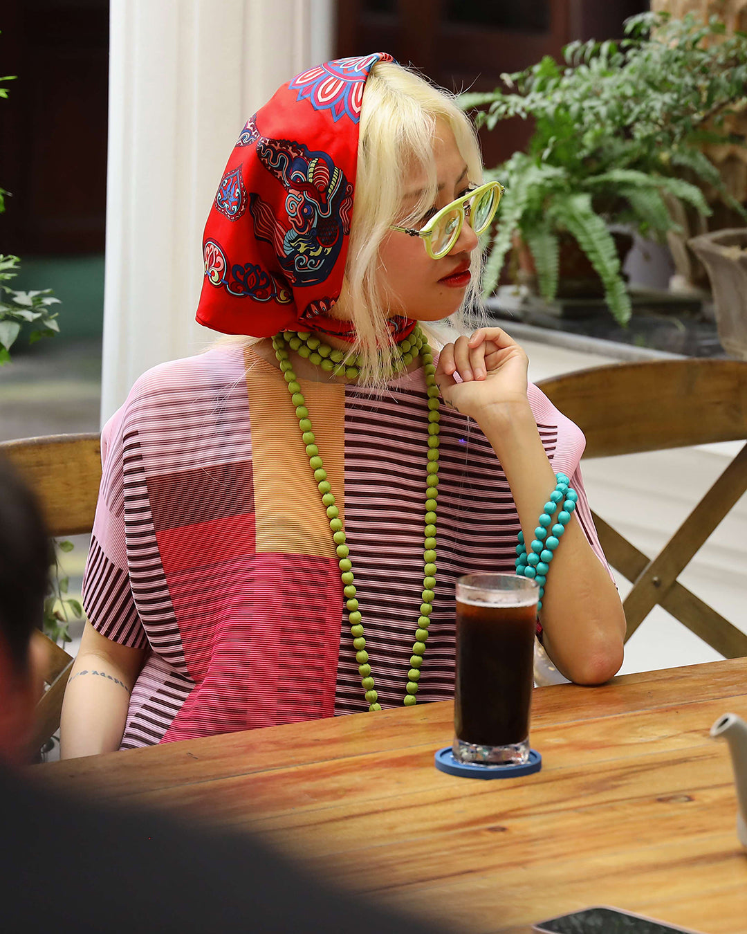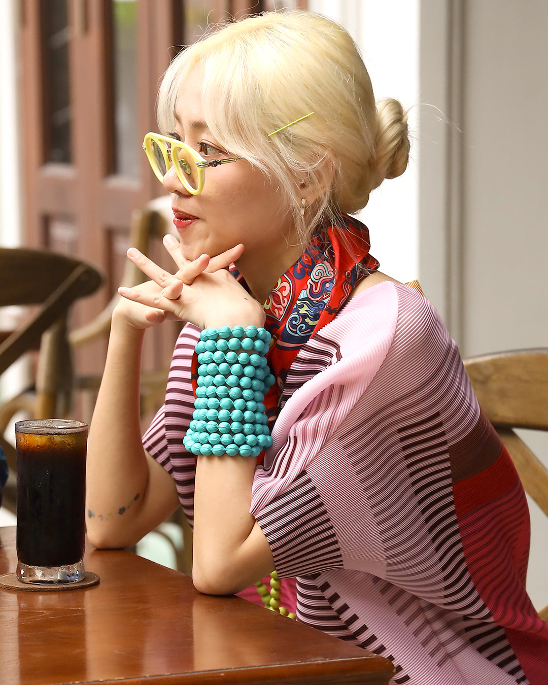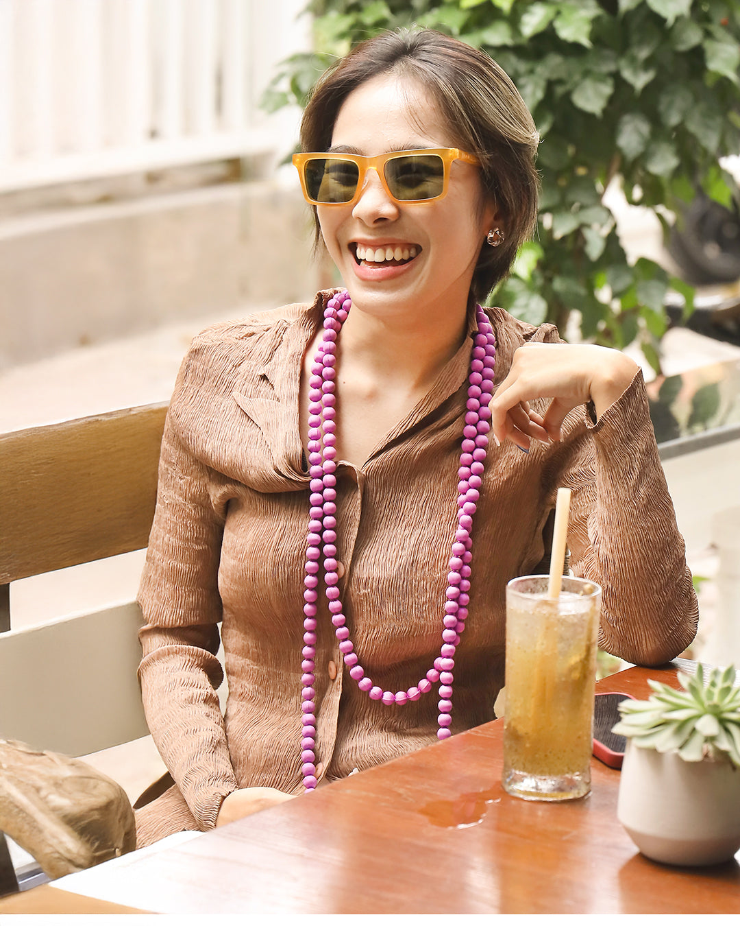 With its generous length and lightweight nature, the 220cm silk-wrapped wooden bead necklace offers various styling options: