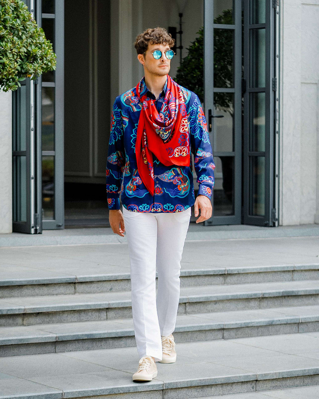 - Fabric: Hand-printed silk scarves - Material: 100% mulberry silk - Design: Meaningful Vietnamese historic print in morden concept - Craftmanship: unique print matching technique in fashion design - Size: S - M - L - Customizable